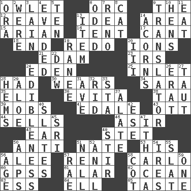 ACROSS 1. A small or young owl 6. The grampus (Milton) 9. Definite Article 12. Break or tear apart 13. It may be bright or harebrained 14. Type of rug 15. Believer in; advocate of (suffix) 16. Portable shelter 17. Patter 18. Conclude 19. Do over again 20. Charged atoms 21. Dutch treat 23. Big collection agency 24. Paradise 25. An arm off of a larger body of water 28. Possessed 30. Erodes 34. "Two Mules for Sister ____" 35. Biblical high priest 36. Webber/Rice musical 38. The 19th letter of the Greek alphabet 39. Disorderly crowds 41. Peak District village in England 43. Baseball player Mel 44. Exchanges for money 46. SW Saudi Arabia district 48. Hearing organ 49. Proofreading order 50. Against 51. Nathan's nickname 53. Part of HMS, perhaps 56. Toward shelter 57. Painter Guido (1575-1642) 58. Monte _, Las Vegas Hotel/Casino 60. Global Positioning Systems (abbr.) 61. Having or resembling wings 62. Sea 63. Double-curved letter 64. Pipe bend 65. Clothes sense DOWN 1. Mouth or opening 2. We are 3. (Had) reclined 4. Dodged 5. "___ Little Indians" 6. Wrote a lyric poem 7. Former U.S. Attorney General Janet 8. Feline 9. Interpreter 10. Coop moms 11. Ingest 13. A whole individual unit 14. Oak nuts 19. The wife of a rajah (variant) 20. One more than two 22. Morning condensation 24. The property of being fit to eat 26. Part of Q.E.F. 27. Drawn tight 28. Cloth borders 29. _ vera 31. "___ Maria" 32. To free from 33. R.R. building 37. Having winglike extensions 40. Chalkboards 42. Compass dir. 45. Indian title of respect (Mr.) 47. New York city 49. Move through with a circular motion 50. High mountains 51. 1994 drama film starring Jodie Foster 52. Of or related to the anus 54. Angers 55. Narrow board 56. Ripen 57. Actress Charlotte 58. Small bed 59. Single