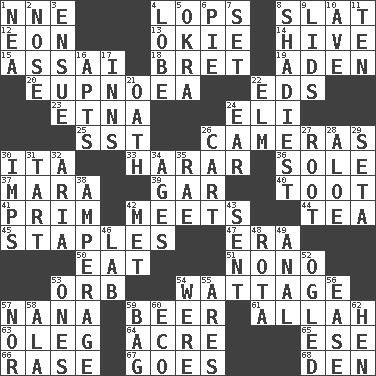 ACROSS 1. Compass dir. 4. Chops off 8. Narrow board 12. Period of immesurable duration 13. Migrant worker of the '30s 14. Hub of activity 15. Slender Brazilian palm 18. Cy Young winner Saberhagen 19. Arabian gulf 20. Normal relaxed breathing 22. Begley and Asner 23. Inactive volcano in Sicily 24. Biblical high priest 25. Fast jet (abbr.) 26. Devices for capturing images 30. Call ___ day 33. Ethiopian city, capital of Harari 36. Not divided or shared with others 37. Hindu Mythology: god of death 39. Slender fish 40. A blast of a horn 41. Demure 42. Confronts 44. Beverage made from leaves 45. Paper fasteners 47. Epoch 50. Ingest 51. Words to Nanette 53. Globe 54. Electrical Measurement 57. Nanny 59. Fermented drink made from hops 61. Assad's deity 63. Cassini of fashion 64. 43,560 square feet 65. Compass dir. 66. To erase 67. Moves 68. Lair DOWN 1. Teachers' org. 2. Sense of smell 3. Follow as a consequence or result 4. Ear part 5. Gumbo ingredient 6. Sliced dessert 7. Put into a specified state 8. Most dark, concealed or hidden 9. Hats (slang) 10. "___ Maria" 11. Nine, plus one 16. Tenement units (abbr.) 17. Lodging establishments 21. Pledge 22. Shade tree 24. Ewer handle 26. Draw slowly or heavily 27. Carrot, for example 28. Medicinal plant 29. Bristle 30. Naughty children 31. Small pie 32. Roberta Peters solo 34. Matures 35. Actress Charlotte 38. Electrical Measurement 42. Was introduced to 43. Emitted 46. Experiment locale 48. Round or rotation of duties 49. Of or related to the anus 52. Stared 53. Washington bills 54. We are 55. Ancient Greek god of war 56. Relaxation 57. Not either 58. Insect wing 59. Paper or plastic container 60. Environmental prefix 62. Layer