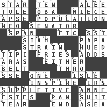 ACROSS 1. Play the lead 5. "___ Little Indians" 8. Toward shelter 12. Lacquered or enameled metalware 13. Chief or king in Benin or Nigeria 14. Sibling's daughter 15. Domed church section 16. Census information 19. Modern: prefix 20. Elected representative 21. Connect, as a bridge 23. And so on (abbr.) 24. Fast jet (abbr.) 27. Thailand, formerly 30. Dad 31. Put through a sieve 34. Became colored 35. Native american tent (variation) 38. Strips of potato fried in deep fat 40. Does sums 41. Ancient river in northeast Turkey 42. One or the other of two 44. Waist strap 45. Through, poetically 46. Compass dir. 47. Single 50. Small island 53. Motivate 57. Big collection agency 59. Supplying deficiencies 63. Queen of England 1702-14 64. _____ Park, CO 65. Baking dish 66. Set of matching outer garments 67. Separate forcefully 68. Conclusion 69. At sea DOWN 1. Comedian Laurel of Laurel & Hardy 2. Drinks excessively 3. Columnist Joseph or Stewart 4. To separate or throw off 5. Drink excessively 6. Inky black, to poets 7. California wine valley 8. Small island 9. Luau accessory 10. Environmental prefix 11. Car or cant ending 14. Drug cop 17. Shoshoni 18. Car dealer's back yard 20. In a ____ (agitated or irritated) 22. Aid 24. Saudi Arabian king (1953-1964) 25. Hurried 26. Bits 28. Sandy's bark 29. Female horse 30. N Egypt peninsula 32. One more than two 33. Remaining after all deductions 35. Bar bills 36. Angers 37. Light colored 39. Quiet! 43. One of the Great Lakes 47. Lubricates 48. Compass dir. 49. Eastern Standard Time (abbr.) 51. "_ and Lucy" (Charlie Brown theme song) 52. Bert's buddy 54. Corncob 55. "Terrible" tsar 56. Tear apart 58. Stalk of a moss capsule 59. Put into a specified state 60. Purpose 61. Parent Teacher Assoc. 62. For each 63. White ___ sheet