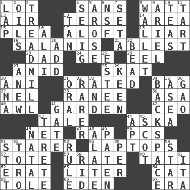 ACROSS 1. Car dealer's back yard 4. Without 8. Electrical Unit 12. Wind 13. Laconic 14. Type of rug 15. Entreaty 17. Upward 18. One who doesn't tell the truth 19. Deli grouping 21. Most capable 23. Male parent 24. Turn to the right 26. Snakelike fish 27. Among 28. Three-handed card game 30. Black tropical American cuckoo 31. Spoke pompously 34. Paper or plastic container 37. Cartoonist voice _ Blanc 38. Indian princess (variant) 39. White ___ sheet 40. Leather borer 41. Place where plants grow 42. Corporate head (abbr.) 43. Lie 44. "____ silly question..." 46. Fish or hair follower 47. Reproach for some lapse or misdeed 50. Personal Computers (abbr.) 51. A viewer who gazes fixedly 54. Portable computers 57. Haul 58. A salt of uric acid 60. Jacques of French films 62. Part of Q.E.F. 63. 61 cubic inches 64. Domesticated feline 65. Lacquered or enameled metalware 66. Genesis locale 67. Period DOWN 1. Infant locale 2. Lubricates 3. Excercise machine 4. Former Milwaukee Brewers owner Bud 5. Came up 6. Overdraft (abbr.) 7. Bristle 8. Place for singles 9. Satellite of Uranus 10. Afternoon social gatherings 11. Small pie 13. Scottish cap 16. Mountain range southwest of Kyrgyzstan 20. Increase 22. Necklace unit 25. First name in cosmetics 27. Afresh 29. Peachy ____! 30. Wet nurse (var.) 31. Taken by mouth 32. More valued for its uncommonness 33. Also 34. Keyboard key 35. At sea 36. E Mali city 41. Yard entry 43. Cylindrical with tapered ends 44. Fitting 45. Highlander 46. Relating to or accompanying birth 48. Having winglike extensions 49. Eucharist need 51. Proofreading order 52. "Corrida" creature 53. Governing power 55. For each 56. Play the lead 59. To free from 61. Call ___ day