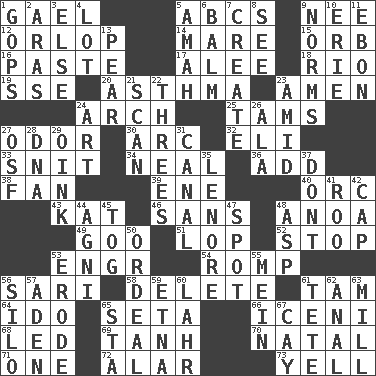 ACROSS 1. Highlander 5. Lettered men learn these first 9. Born 12. Lowest deck of a ship 14. Female horse 15. Globe 16. Thick mixture 17. Toward shelter 18. _ de Janeiro 19. Compass dir. 20. Respiratory problem 23. So be it 24. Bowlike part 25. Scottish caps 27. Scent 30. Curve 32. Biblical high priest 33. In a ____ (agitated or irritated) 34. Anneal 36. Find the sum of 38. Avid follower 39. Compass dir. 40. The grampus (Milton) 43. Krazy ___ of comics 46. Without 48. Small Philippine buffalo 49. Thick or sticky substance 51. Trim (branches) 52. Cease 53. Engineer (abbr.) 54. Frolic 56. Indian skirt 58. Keyboard key 61. Scottish cap 64. Wedding promise 65. Bristle 66. Ancient Celtic tribe of eastern Britain 68. Directed 69. Hyperbolic tangent 70. Brizilian seaport 71. Single 72. Having or resembling wings 73. Shout DOWN 1. Republicans 2. Caspian sea tributary 3. Otherwise 4. Car dealer's back yard 5. Wet nurse 6. Lip ointment 7. Cause to be 8. Perceive with the eye 9. Typical standards 10. One of the Great Lakes 11. Inky black, to poets 13. Lightbulb-shaped fruit 21. Glance over 22. Triplets 23. Among 24. Tate display 26. In the manner of 27. Order of Saint Francis (abbr.) 28. Heredity factor (abbr.) 29. Pig sound 31. Lessep's creation 35. Poe poem 37. Do not 41. Friend of Pooh 42. Head covering 44. Hindu god of fire 45. Coat; cloak 47. Blemish 48. Viper 50. Severe or trying experience 53. Wear away 55. Count _ (2 wds.) 56. Grain storage tower 57. An important port of Yemen 59. Inactive volcano in Sicily 60. Cowardly lion portrayer 61. Wig 62. Of or related to the anus 63. Place where flour is made 65. R.R. building 67. Island