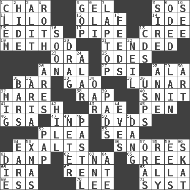 ACROSS 1. Burn to charcoal 5. Set 8. Mayday 11. _ and Stitch 12. Norwegian king 14. Binary compound 15. Proofreads 17. Corncob 18. Algonquian 19. Mode 21. Looked after 23. Mouth or opening 25. Lyric poems 26. Of or related to the anus 27. Air pressure measure (abbr.) 28. Wing 31. Long, evenly shaped piece 33. E Mali city 35. Type of eclipse 37. Female horse 38. Strike 40. In a ____ (agitated or irritated) 41. From or relating to Ireland 43. Actress Charlotte 45. Fenced enclosure 46. Girls' org. (abbr.) 47. Mischievous child 50. Movie discs 52. Entreaty 53. Ocean 54. Glorifies 56. Sounds asleep 61. Moist 62. Inactive volcano in Sicily 65. Hellenic 66. Lyricist Gershwin 67. Monthly bill 68. Silent film actress Nazimova 69. Curvy letter 70. Area sheltered from the wind 71. System (abbr.) DOWN 1. To starve (Brit.) 2. Flintstone garb 3. Came down and settled, as after flight 4. Writer of Portnoy's Complaint (1969) 5. Grand Old Party 6. Biblical high priest 7. Portable computer 8. Beget 9. Wrote a lyric poem 10. Perceive with the eye 13. Gives food to 16. Within a short period 18. Music discs 20. To trail on the ground 22. Famous astronaut Armstrong 24. Having or resembling wings 26. Ancient Greek god of war 28. Queen of England 1702-14 29. (Had) reclined 30. Tate display 31. Taverns 32. Roberta Peters solo 34. Rowing implement 36. United States Postal Service (abbr.) 37. Russian fighter aircraft 39. Groovy apts. 42. Land elevation 44. Nights before holidays 48. Distance measurement 49. Soft color 51. Mild oath, euphamism for damn 52. Infant food 54. Hearing organs 55. Dec. holiday 57. Mouths or openings 58. Depend 59. Snakelike fish 60. Three-handed card game 61. Expire 63. Compass dir. 64. Had dinner