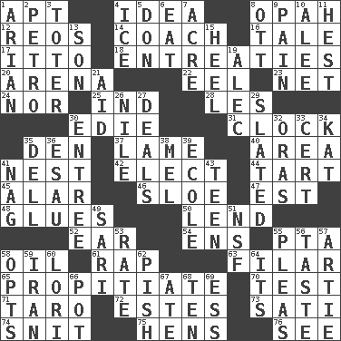 ACROSS 1. Fitting 4. The content of cognition 8. Brightly colored fish 12. Vintage cars 14. Team commander 16. Story 17. "Tell ____ the Marines!" 18. Pleas 20. Sports stadium 22. Snakelike fish 23. Fish or hair follower 24. Not either 25. Working for oneself (abbr.) 28. French article 30. Singer Brickell 31. Timepiece 35. Lair 37. Unable to walk 40. Type of rug 41. A home for chicks 42. Choose 44. Small pie 45. Having or resembling wings 46. A type of plum 47. Eastern Standard Time (abbr.) 48. Cements 50. Grant temporary use of 52. Hearing organ 54. Followers of ems 55. Parent Teacher Association (abbr.) 58. Lubricate 61. Hit sharply and swiftly 63. Of or pertaining to a thread or threads 65. Appease 70. Trial 71. Pacific island yam 72. _____ Park, CO 73. Suttee (variant) 74. In a ____ (agitated or irritated) 75. Coop moms 76. Observe DOWN 1. Believer in; advocate of (suffix) 2. Stone: prefix 3. Carrier 4. Frozen water 5. Spanish title 6. Erode 7. 1/640 square mile 8. Baseball player Mel 9. Ache 10. Toward shelter 11. Behest 13. Manchild 15. Person who is morally reprehensible 19. Actor Baldwin 21. Help 26. "Death on the ____" 27. Allots cards 29. Scheduled 30. Main course 32. Mouths or openings 33. An absolute certainty 34. Krazy ___ of comics 35. Small valley 36. He sold his birthright 38. Cartoonist voice _ Blanc 39. Learning spot: Fr. 41. Tired old horse 43. Adolescent 49. Indian skirt 51. Overdraft (abbr.) 53. Pace 55. Entreaties 56. Clothes sense 57. Nick name for Arthur 58. Elects 59. SW Asia republic 60. Australian parrot (variant) 62. Expression of disdain 64. ___ a Wonderful Life 66. Plant holder 67. Had dinner 68. "___ Little Indians" 69. Curvy letter