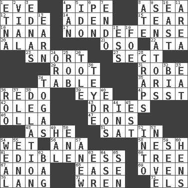 ACROSS 1. Night before a holiday 4. Corncob 8. At sea 12. Periodic rise and fall of the sea level 14. An important port of Yemen 15. Pull apart 16. Grandmother 17. Unrelated to defense, as in spending 20. Having or resembling wings 21. Bear (Spanish) 22. "One Day ___ Time" 23. Derisive sound 27. Religious group 29. Carrot, for example 31. Loose flowing garment 34. Eating place 35. Roberta Peters solo 36. Redecorate 39. Sight organ 41. Inconspicuous attention getter 42. Cassini of fashion 43. Frees from moisture 46. Spanish pot 47. Immeasurably long periods of time 48. American tennis player Robert 51. Smooth fabric 54. Soggy 56. Santa ___, CA 58. Tender 61. The property of being fit to eat 66. Family _ (genealogy) 67. Small Philippine buffalo 68. Comfort 69. Baking chamber 70. Long (Scottish) 71. Songbird 72. Raised railways DOWN 1. Inactive volcano in Sicily 2. Small bottle 3. Ferber et al. 4. Baking dish 5. Wedding promise 6. Animal enclosure 7. Inside; within (prefix) 8. Had dinner 9. Elected representatives 10. Compass direction 11. Length times width 13. Merit 18. Curvy letter 19. Enemy 24. Mouth or opening 25. Director Reiner 26. Lacquered or enameled metalware 28. Dice game 30. Miss Universe 1986, Barbara Palacios _ 32. Again 33. Erode 34. Ancient Roman robes 36. Friend of Pooh 37. Pipe bend 38. Accusation by an informer 40. Greek god of love 44. _ tizzy (2 wds.) 45. Eastern Standard Time (abbr.) 49. Actor Linden 50. Compass dir. 52. To the inside or interior of 53. Effrontery 54. Welt 55. Pulitzer Prize-winning author Ferber 57. Afresh 59. Sew up the eyelids of hawks and falcons 60. Coop moms 62. Container for groceries 63. Ewer handle 64. Compass dir. 65. Elected rep.
