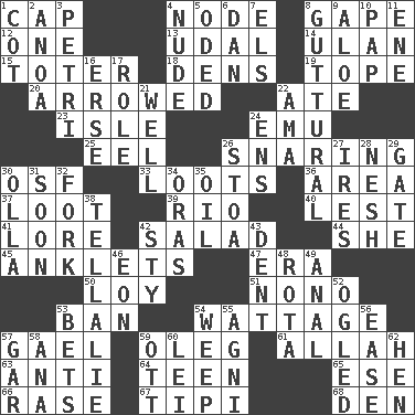 ACROSS 1. Head covering 4. Connecting point 8. Yawn 12. Single 13. Allodial 14. ____ Bator, Mongolia 15. Carrier 18. Hiding places for outlaws 19. Drink excessively 20. Moved like an arrow 22. Had dinner 23. Capri or Wight 24. Australian flightless bird 25. Snakelike fish 26. Catching in a trap 30. Order of Saint Francis (abbr.) 33. Plunders 36. Type of rug 37. Spoils 39. River (Sp.) 40. For fear that 41. Old wives' tales, e.g. 42. First course 44. A female animal or person 45. Short socks 47. Epoch 50. Myrna of the movies 51. Words to Nanette 53. Prohibit 54. Electrical Measurement 57. Highlander 59. Cassini of fashion 61. Assad's deity 63. Opposed to 64. Adolescent 65. Compass dir. 66. To erase 67. Native american tent (variation) 68. Lair DOWN 1. Small bed 2. Small Philippine buffalo 3. _ dish (used to culture cells) 4. Unadorned 5. Wrote a lyric poem 6. One of the 12 tribes of Israel 7. Raised railways 8. From the throat 9. Medicinal plant 10. Infant food 11. Compass dir. 16. Celtic language 17. Hero or heavy, e.g. 21. Water source 22. Wet nurse (var.) 24. Followers of ems 26. Portico 27. Angers 28. Tender 29. Yard entry 30. Water jar 31. Within a short period 32. Tined utensil 34. Mouths or openings 35. Petroleum 38. Copy Pinocchio 42. Filthy place 43. Gouge 46. Age 48. Round or rotation of duties 49. Of or related to the anus 52. Stared 53. Stakes 54. Shed a tear 55. Hindu god of fire 56. Comfort 57. Slender fish 58. Santa ___, CA 59. Baseball player Mel 60. Flowery wreath 62. Layer