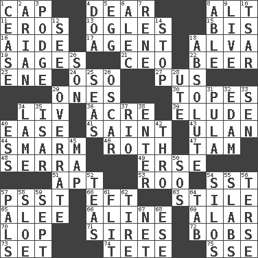 ACROSS 1. Head covering 4. Letter starter 8. Keyboard modifier key 11. Greek god of love 13. Stares at amorously 15. Again 16. Helper 17. Representative 18. Inventor's middle name 19. Gurus 21. Corporate head (abbr.) 22. Fermented drink made from hops 23. Compass dir. 24. Bear (Spanish) 27. Tenth month of the Hindu calendar 29. Singles 30. Drinks excessively 34. 54 in ancient Rome 36. 43,560 square feet 39. Dodge 40. Comfort 41. Inhabitant of Heaven 43. ____ Bator, Mongolia 44. Excessive but superficial compliments 46. Writer of Portnoy's Complaint (1969) 47. Scottish cap 48. Spanish missionary in California 49. Celtic language 51. Fitting 53. Friend of Pooh 54. Fast jet (abbr.) 57. Inconspicuous attention getter 60. Newt 63. Vertical member of a panel or frame 65. Toward shelter 66. Place in a line 69. Having or resembling wings 70. Trim (branches) 71. Fathers 72. Moves up and down 73. Arrange properly for use 74. False hair 75. Compass dir. DOWN 1. Stop 2. Believer in; advocate of (suffix) 3. Porridge 4. ___ good deed 5. Oval reproductive body of a fowl 6. Actor Baldwin 7. French philosopher Descartes 8. Competent 9. Moving, as bait 10. Russian ruler of old 12. Perceive with the eye 14. Cease 18. Utter; complete 20. Male child 25. Oceans 26. Motion picture award 28. Shoshoni 29. Make much ado about nothing 31. Monetary unit of Botswana 32. Dutch treat 33. Elected rep. 34. Unable to walk 35. Austrian river, tributary to the Danube 37. _ de Janeiro 38. Keyboard key 40. Curvy letter 42. Through, poetically 45. Atlas unit 50. Mayday 52. Beverages made from leaves 54. Grain storage towers 55. Broad, flat, thick pieces 56. Laconic 57. Friends 58. A type of plum 59. Back-to-school mo. 61. Secret move to avoid paying debts 62. Become fatigued 64. Keyboard key 67. Fish or hair follower 68. Compass dir.