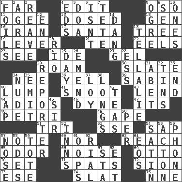 ACROSS 1. Distant 4. Prepare for publication 8. Bear (Spanish) 11. Double curve, resembling the letter S 13. Administered medicine 15. Commissioned military rank (abbr.) 16. SW Asia republic 17. Before Barbara or Clara 18. Family _ (genealogy) 19. Prying instrument 21. Nine, plus one 22. Snakelike fish 23. Perceive with the eye 24. Binary compound 27. Set 29. Wander aimlessly 30. Schedule 34. Born 36. Shout 39. Unit of acoustic absorption 40. Mass 41. Snob 43. Grant temporary use of 44. Goodbye (Sp.) 46. Unit of force 47. ___ a Wonderful Life 48. _ dish (used to culture cells) 49. Stare wonderingly 51. Three (prefix) 53. Compass dir. 54. Plant excrement 57. Short letter 60. Not either 63. Arrive at 65. Aroma 66. Annoying sound 69. Von Bismarck 70. Put into a specified state 71. Arguments over trivial matters 72. The Jewish people; Israel 73. Compass dir. 74. Narrow board 75. Compass dir. DOWN 1. Fencing necessities 2. Match 3. Rob, plunder, or pillage 4. Begley and Asner 5. ___ good deed 6. Is not 7. False hair 8. Legendary monster 9. Sew up the eyelids of hawks and falcons 10. Washington bills 12. Compass dir. 14. Mild oath, euphamism for damn 18. Copy Pinocchio 20. River (Sp.) 25. 24-hour periods 26. Make improvements or corrections to 28. Double-curved letter 29. Newsperson 31. Collude with 32. Airtight sealed metal containers 33. Conclusion 34. Unadorned 35. Give off 37. Myrna of the movies 38. Yearns 40. Pet locale 42. Beverages made from leaves 45. Title for a knight 50. For each 52. Restaurants 54. Smooth fabric 55. NE Massachussets city 56. Give a jingle 57. Characteristic smell of wine 58. Lyric poems 59. Lug 61. I made a mistake 62. Monetary unit of Yemen 64. Greek goddess of the dawn 67. R.R. building 68. Eastern Standard Time (abbr.)