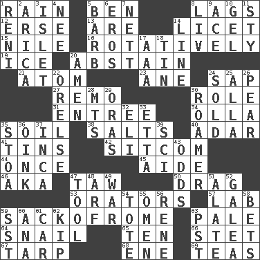 ACROSS 1. Water falling in drops from the sky 5. Benjamin's nick name 8. Straggles 12. Celtic language 13. "We ___ not amused" (Victoria) 14. It is permitted: Lat. 15. "Death on the ____" 16. Producing rotation 19. Frozen water 20. Choose not to consume 21. Smallest unit of an element 23. A saturated hydrocarbon 24. Plant excrement 27. San ____ (Riviera town) 30. Hero or heavy, e.g. 31. Main course 34. Water jar 35. Land 38. Table seasonings 40. The sixth month of the Jewish calendar 41. Metal containers 42. "Cheers" or "Ellen" 44. At one time in the past 45. Helper 46. Alias (abbr.) 47. The 23rd letter of the Hebrew alphabet 50. To be drawn or hauled along 53. Speakers 57. Experiment locale 59. Italian handbag shop? 63. Light colored 64. Slow-paced one 65. "___ Little Indians" 66. Proofreading order 67. Canvas cover 68. Compass dir. 69. Afternoon social gatherings DOWN 1. Painter Guido (1575-1642) 2. N. Chile seaport 3. Small island 4. Born 5. Sharp remark 6. Greek god of love 7. Remaining after all deductions 8. 54 in ancient Rome 9. Adept person 10. Set 11. Filthy place 14. Actor's bit 17. American Automobile Association (abbr.) 18. Metal container 20. So be it 22. Threatening words 24. Exchanged or delivered for money 25. Silent film actress Nazimova 26. Lightbulb-shaped fruit 28. Mountains (abbr.) 29. Mouths or openings 30. Wanderer 32. Biblical high priest 33. Singer James 35. Portico 36. Pig sound 37. South American Indian 39. _-fi 43. Likelihood 47. Utensil 48. Sandy's bark 49. Armed conflict 51. Having winglike extensions 52. An organ shaped like a helmet 54. Carryall 55. Sign of things to come 56. French philosopher Descartes 58. Antes 59. Fast jet (abbr.) 60. Santa ___, CA 61. 4-wheeled motor vehicle 62. Monetary unit of Laos 63. Pacific Standard Time (abbr.)