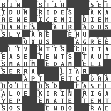 ACROSS 1. Storage container 4. Disorderly outburst 8. Put into a specified state 11. Goddess of spring and wife of Bragi 13. Amusement-park features 15. Alias (abbr.) 16. French philosopher Descartes 17. Ancient Celtic tribe of eastern Britain 18. South Vietnam president (1954) 19. Natives or inhabitants of Denmark 21. Wind 22. Sums up 23. Wily 24. "We ___ not amused" (Victoria) 27. Australian flightless bird 29. The longest river in Central Asia 30. Match 34. 54 in ancient Rome 36. Nuclear Threat Initiatives 39. Riviera of "Kiss of the Spider Woman" 40. Comfort 41. Portable shelters 43. Tense 44. Excessive but superficial compliments 46. Dutch treat 47. Connecticut Ivy Leaguer 48. Spanish missionary in California 49. One who doesn't tell the truth 51. Fitting 53. And so on (abbr.) 54. Mouth or opening 57. Stupid person 60. Bear (Spanish) 63. Artist's stand 65. _ vera 66. Japanese brewing company 69. Port city in Latvia 70. Slangy assent 71. Maternal 72. Portable shelter 73. Mayday 74. Inside; within (prefix) 75. Actress Charlotte DOWN 1. Avian creatures 2. Standard of perfection 3. Pet term 4. Indian title of respect (Mr.) 5. Nervous spasm 6. The main thing one is thinking about 7. Painter Guido (1575-1642) 8. Stated 9. Supplemented with great effort 10. Scottish caps 12. Born 14. Title for a man of rank and authority 18. Female offspring 20. Saxophone 25. Undersized animal 26. First name in cosmetics 28. Big _ 29. Make much ado about nothing 31. Monetary unit of Yemen 32. Needle case 33. Ingest 34. Unable to walk 35. Austrian river, tributary to the Danube 37. Working for oneself (abbr.) 38. Having lost freshness 40. Double-curved letter 42. Stricken, poetically 45. Atlas unit 50. Adept person 52. Puff or smoke 54. Flexible twig of a willow tree 55. Rain (Swedish) 56. Having winglike extensions 57. 24-hour periods 58. Butter sub 59. Chops off 61. Trig term 62. NW Algerian seaport 64. Nonscientific branch of learning 67. It would 68. Modern: prefix