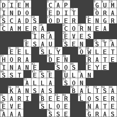 ACROSS 1. South Vietnam president (1954) 5. Head covering 8. Chewing product 11. _ china 12. Prepare for publication 14. Mouth or opening 15. Tons 17. River in Europe 18. Engineer (abbr.) 19. Device for capturing images 21. Pupil covering 23. Retirement account (abbr.) 25. Nights before holidays 26. He sold his birthright 27. Elected rep. 28. R.R. building 31. Snakelike fish 33. Insidious 35. A small or young owl 37. Israeli folk dance 38. Lair 40. Assign a rank or rating to 41. Silly 43. Mayday 45. Sight organ 46. Fast jet (abbr.) 47. Compass dir. 50. Uhlan (variant) 52. Silent film actress Nazimova 53. Boy, to dad 54. Sunflower state 56. Greek mezzo-soprano Agnes 61. Indian skirt 62. Fermented drink made from hops 65. Failure 66. Night before a holiday 67. _ gin 68. Nathan's nickname 69. Auto club (abbr.) 70. Compass dir. 71. Pate de foie ____ DOWN 1. Plate 2. South American Indian 3. Dutch treat 4. Method 5. Corporate head (abbr.) 6. Say or write further 7. Components 8. Went 9. Capital and largest city of Mongolia 10. Third mo. 13. Collection of objects 16. Indian titles of respect 18. Followers of ems 20. Caspian sea tributary 22. Western Nevada city 24. Old (Scot.) 26. Flair 28. Kill 29. False hair 30. Had dinner 31. Immeasurably long periods of time 32. Part of Q.E.F. 34. It is so 36. Songbird 37. Part of HMS, perhaps 39. Horse sense 42. Snakelike fish 44. Oscar Madison type 48. Thick slices 49. Artist's stands 51. Of or related to the anus 52. Black tropical American cuckoo 54. Polynesian shrub of the pepper family 55. Type of rug 57. Protracted 58. Russian ruler of old 59. Stalk of a moss capsule 60. Ancient Greek god of war 61. Ocean 63. Greek goddess of the dawn 64. To sift