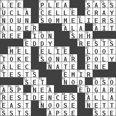 ACROSS 1. Area sheltered from the wind 4. Entreaty 8. Backtalk 12. Southern CA. univ. 14. Cell (Danish) 16. Supercomputer manufacturer 17. Part of speech 18. Wine waiters 20. Tree or shrub in the Birch family 22. Wing 23. Small island 24. To sift 25. Electrically charged atom 28. Quiet! 30. Whirlpool 31. Musical pauses 35. Cartoonist voice _ Blanc 37. Writer Wiesel 40. Spoils 41. Puff or smoke 42. Underwater navigation system 44. Much (prefix) 45. Actor Baldwin 46. Nathan's nickname 47. Compass dir. 48. Trials 50. Independent ruler or chieftain 52. Put into a specified state 54. Allow head to fall sleepily 55. Bear (Spanish) 58. Viper 61. Teachers' org. 63. _ Allan Poe 65. Homes 70. Silent film actress Nazimova 71. 90 degrees 72. Trap for birds or small mammals 73. Remaining after all deductions 74. Fast planes 75. Domed church section 76. Compass dir. DOWN 1. Type of eclipse 2. Learning spot: Fr. 3. Evade 4. Personal Computers (abbr.) 5. Lion 6. Shade tree 7. _ mater 8. _-fi 9. Length times width 10. Indian skirt 11. System (abbr.) 13. A saturated hydrocarbon 15. Snakelike fish 19. Cowardly lion portrayer 21. To free from 26. Lyric poems 27. High-strength synthetic material 29. Assistant 30. Opts 32. Within a short period 33. Lacquered or enameled metalware 34. Filthy place 35. Undercover agent 36. Supplements with great effort 38. _ tizzy (2 wds.) 39. Ingested 41. Make lace 43. San ____ (Riviera town) 49. Transmit 51. Binary compound 53. Adolescent 55. Stares at amorously 56. Table seasonings 57. Declaim 58. Ancient Greek god of war 59. Oceans 60. Inconspicuous attention getter 62. Small Philippine buffalo 64. One of the 12 tribes of Israel 66. ___ a Wonderful Life 67. Police officer (slang) 68. Double-curved letter 69. Observe