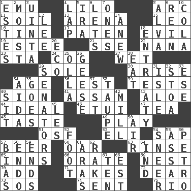 ACROSS 1. Australian flightless bird 4. _ and Stitch 8. Curve 11. Earth 13. Sports stadium 15. Lion 16. Prong on a fork 17. Eucharist need 18. Tending to cause great harm 19. First name in cosmetics 21. Compass dir. 22. Nanny 23. R.R. building 24. Gear tooth 27. Soggy 29. Flatfish 30. Ascend 34. Ripen 36. For fear that 39. Trials 40. The Jewish people; Israel 41. Indian state 43. _ vera 44. Standard of perfection 46. Needle holder 47. Afternoon social gathering 48. Clothes sense 49. Shaw product 51. Order of Saint Francis (abbr.) 53. Connecticut Ivy Leaguer 54. Plant excrement 57. Fermented drink made from hops 60. Boat paddle 63. Remove soap 65. Taverns 66. Speak pompously 69. Egg locale 70. Say or write further 71. Proceeds 72. Letter starter 73. Distress signal 74. Transmitted 75. River (Sp.) DOWN 1. _____ Park, CO 2. Wet 3. National forest in Provo, Utah 4. Infant locale 5. Retirement account (abbr.) 6. Allows 7. Singles 8. Inventor's middle name 9. It's straight from the horse's mouth 10. Root beer relative 12. Area sheltered from the wind 14. Afresh 18. Plea 20. Environmental prefix 25. Spanish pot 26. Honkers 28. Ingest 29. Elected representatives 31. Small island 32. Portico 33. Compass dir. 34. Opera by Verdi 35. Moves 37. Fast jet (abbr.) 38. Grayish beige 40. Be seated 42. Place where flour is made 45. French article 50. Atmosphere 52. One third of a yard 54. Contemptuous expression 55. Slender Brazilian palm 56. Stone: prefix 57. Prejudice 58. Inside; within (prefix) 59. Conclusions 61. Caspian sea tributary 62. Libertine 64. Working for oneself (abbr.) 67. Nine, plus one 68. Eastern Standard Time (abbr.)