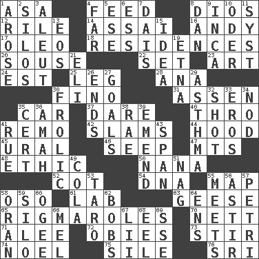 ACROSS 1. White ___ sheet 4. Nourish 8. "Vaya con ____" 12. Cause heat under the collar 14. Slender Brazilian palm 16. "60 Minutes" Commentator Rooney 17. Butter sub 18. Homes 20. Boozer 22. Arrange properly for use 23. Tate display 24. Eastern Standard Time (abbr.) 25. Part of a journey 28. Santa ___, CA 30. Fine (Spanish) 31. NE Netherlands city 35. Auto 37. Have the gumption 40. Through, poetically 41. San ____ (Riviera town) 42. Shuts with force 44. Parka part 45. Mountain range 46. Ooze 47. Mountains (abbr.) 48. Moral principle 50. Nanny 52. Small bed 54. Heredity factor (abbr.) 55. Atlas unit 58. Bear (Spanish) 61. Experiment locale 63. Honkers 65. Complicated, petty procedures 70. Remaining after all deductions 71. Toward shelter 72. Off-Broadway awards 73. Disorderly outburst 74. Christmas carol 75. Drop; flow; fall 76. Indian title of respect (Mr.) DOWN 1. Came up 2. Grain storage towers 3. Eskimo relative 4. At a great distance 5. Compass dir. 6. Double-curved letter 7. Raised platform 8. Daniel's nick name 9. South American Indian 10. River in Europe 11. System (abbr.) 13. Greek goddess of the dawn 15. The main thing one is thinking about 19. Inactive volcano in Sicily 21. Connecticut Ivy Leaguer 26. Conclusions 27. Finish lines 29. Respiratory problem 30. Romp 32. Attempt 33. Greek god of love 34. Lower and raise head in agreement 35. Sure thing 36. Nanny 38. Actress Charlotte 39. Make improvements or corrections to 41. Regret 43. Connect, as a bridge 49. Root beer relative 51. Tired old horse 53. Pacific island yam 55. Confronts 56. Having gotten out of bed 57. _ dish (used to culture cells) 58. Northwest Algerian city 59. Grain storage tower 60. Double curve, resembling the letter S 62. Moves up and down 64. Followers of ems 66. Cartoonist voice _ Blanc 67. Cards in a Roman deck? 68. Snakelike fish 69. Compass dir.