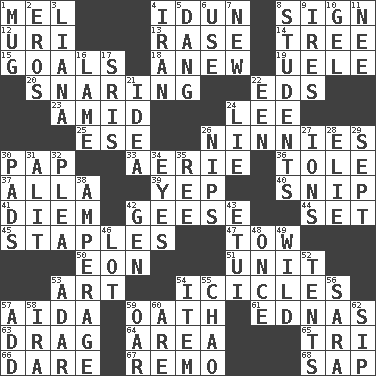 ACROSS 1. Cartoonist voice _ Blanc 4. Goddess of spring and wife of Bragi 8. Public display of a written message 12. RI univ. 13. To erase 14. Family _ (genealogy) 15. Finish lines 18. Afresh 19. Ubangi River tributary 20. Catching in a trap 22. Begley and Asner 23. Among 24. Area sheltered from the wind 25. Compass dir. 26. Fools 30. Infant food 33. Nest on high 36. Lacquered or enameled metalware 37. Silent film actress Nazimova 39. Slangy assent 40. Sever or remove by pinching or nipping 41. South Vietnam president (1954) 42. Honkers 44. Put into a specified state 45. Paper fasteners 47. Pull behind 50. Age 51. A single undivided whole 53. Nonscientific branch of learning 54. Winter's stalactites 57. Opera by Verdi 59. Pledge 61. Ferber et al. 63. To trail on the ground 64. Type of rug 65. Three (prefix) 66. Have the gumption 67. San ____ (Riviera town) 68. Plant excrement DOWN 1. Java container 2. Greek god of love 3. Woody, climbing, usually tropical plant 4. SW Asia republic 5. Mild oath, euphamism for damn 6. Purpose 7. ___ Haven, CT 8. SAT takers 9. Angers 10. Set 11. Born 16. Unable to walk 17. Indian titles of respect 21. It may be bright or harebrained 22. Car or cant ending 24. Untruth 26. Cuts off 27. Charged particles 28. Writer Wiesel 29. Back-to-school mo. 30. Groovy apts. 31. Set down 32. Entreaty 34. Sight organs 35. To sift 38. Electrical Measurement 42. Commissioned mil. rank 43. Needle holder 46. Car dealer's back yard 48. Single time 49. Rampant 52. Portable shelters 53. The sixth month of the Jewish calendar 54. Detail 55. US Secretary of Labor Elaine L. _ 56. "Two Mules for Sister ____" 57. Find the sum of 58. Retirement account (abbr.) 59. Boat paddle 60. "We ___ not amused" (Victoria) 62. Small drink