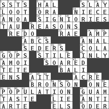 ACROSS 1. Fast planes 5. Actor Linden 8. Kill 12. Spoils 13. Mouth or opening 14. Sibling's daughter 15. Small Philippine buffalo 16. Seigniories (variant) 19. The 19th letter of the Greek alphabet 20. Thinks logically 21. Do over again 23. Actress Charlotte 24. Electrical Unit 27. Lettered men learn these first 30. Of or related to the anus 31. Spring feasts 34. Root beer relative 35. Republicans 38. Vertical member of a panel or frame 40. In an inward manner 41. Mine, in Marseilles 42. Flew 44. False hair 45. Indonesian resort city 46. Followers of ems 47. Small island 50. 43,560 square feet 53. "Death Wish" actor 57. Single 59. Census information 63. Island territory of the United States 64. Clothes sense 65. Whopper 66. Against 67. Johnson of "Laugh-In" 68. Raised railways 69. Baltic tributary DOWN 1. Narrow board 2. Underwater navigation system 3. Woman's close-fitting hat 4. R.R. building 5. Stockings 6. Operatic vocal solo 7. Fails to keep up a pace 8. Title for a knight 9. Flowery wreath 10. Adept person 11. Consenting reply 14. Olfactory organ 17. Not either 18. _ tizzy (2 wds.) 20. Loose flowing garment 22. Hyrax 24. At once, immediately (arch.) 25. Shopping center 26. Romp 28. Music discs 29. Arranges properly for use 30. Being or containing an acid 32. River (Sp.) 33. Broad, flat, thick piece 35. Yard entry 36. Sign of things to come 37. Plant holders 39. Epoch 43. Enthusiasm 47. Competent 48. Retirement account (abbr.) 49. Small child 51. Having a circular shape 52. Related on the mother's side 54. Mediterranean tributary 55. Earth 56. Washington bills 58. Independent ruler or chieftain 59. Parent Teacher Assoc. 60. Boat paddle 61. Pacific Standard Time (abbr.) 62. Shoshoni 63. E Mali city