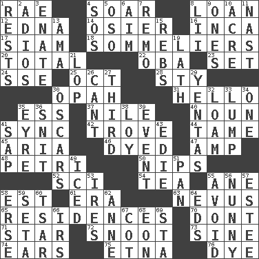 ACROSS 1. Actress Charlotte 4. Fly high 8. Grant temporary use of 12. Pulitzer Prize-winning author Ferber 14. Flexible twig of a willow tree 16. South American Indian 17. Thailand, formerly 18. Wine waiters 20. Add up to 22. Chief or king in Benin or Nigeria 23. Put into a specified state 24. Compass dir. 25. Sep. follower 28. Filthy place 30. Brightly colored fish 31. Phone greeting 35. Double-curved letter 37. Mediterranean tributary 40. Part of speech 41. Synchronize (abbr.) 42. Collection of objects 44. Docile 45. Operatic vocal solo 46. Colored 47. Electrical Unit 48. _ dish (used to culture cells) 50. Cuts off 52. _-fi 54. Beverage made from leaves 55. A saturated hydrocarbon 58. Eastern Standard Time (abbr.) 61. Epoch 63. Mole, birthmark 65. Homes 70. Do not 71. Play the lead 72. Snob 73. Trig term 74. Hearing organs 75. Inactive volcano in Sicily 76. Color DOWN 1. Musical pauses 2. Goodbye (Sp.) 3. Related on the mother's side 4. Distress signal 5. Bear (Spanish) 6. Direct toward a target or goal 7. San ____ (Riviera town) 8. Cards in a Roman deck? 9. Washington bills 10. Land measure 11. Political cartoonist Thomas 13. Wet nurse (var.) 15. Confederate soldiers (slang) 19. Thin strip of wood or metal 21. Chop off 26. Patter 27. One of three equal parts 29. Gossips 30. Motion picture awards 32. Rich soil 33. Mass 34. Single 35. Jane of fiction 36. In a ____ (agitated or irritated) 38. Myrna of the movies 39. Incident 41. Plant excrement 43. Singer Brickell 49. On the rocks 51. Baking dish 53. Angers 55. Keep away from 56. Pet term 57. First name in cosmetics 58. Celtic language 59. Stalk of a moss capsule 60. Russian ruler of old 62. Singer Murray 64. Begley and Asner 66. Big collection agency 67. Small bed 68. Age 69. R.R. building