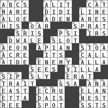 ACROSS 1. Lettered men learn these first 5. Came down and settled, as after flight 9. Domesticated feline 12. Female horse 13. "You Light Up My Life" star Conn 14. Actor's bit 15. Medicinal plant 16. An important port of Yemen 17. Ancient Greek god of war 18. Part of HMS, perhaps 19. Boat paddle 21. Small fatty European fish 22. Indian titles of respect 24. 23rd letter of the Greek alphabet 26. Big collection agency 27. A sleeping potion; an opiate (poet.) 28. Narrow, elongated depression 29. A really long time 30. Bee-related 32. Portico 36. Land measure 37. It is 38. Give a ring to 39. Helper 40. Foe 42. Silent film actress Nazimova 43. Observes 44. Country residence 46. Small drink 49. Cunning 50. Part of Q.E.F. 51. Distinguishing feature 53. Girls' org. (abbr.) 54. Santa ___, CA 57. 90 degrees 58. Shade of tan 61. Flair 62. Singer James 63. Raised platform 64. A home for chicks 65. To riddle 66. Blemish 67. Fast planes DOWN 1. Nanny 2. Indonesian resort city 3. What you're doing now 4. Observe 5. The sixth month of the Jewish calendar 6. Flaplike covering 7. Binary compound 8. Shallow baking pan 9. High-altitude cloud 10. Approach 11. Trials 14. Infant locale 19. Petroleum 20. At sea 21. Be seated 23. Indian princess (variant) 24. Suffix with ecto or cyto 25. Male offspring 27. Tenth: prefix 28. Locates 29. Auto club (abbr.) 31. Abounding in pines 32. Any of the three canals of the cochlea 33. Baron Munchausen's specialties 34. Water jar 35. Chicken ___ king 40. Snakelike fish 41. Jacques Cousteau's middle name 43. Fast jet (abbr.) 45. Lyricist Gershwin 46. Bull 47. Feeling or showing extreme anger 48. Thick mixture 52. Call ___ day 53. Abrupt rush of wind 55. Political cartoonist Thomas 56. Pismires 58. Begley and Asner 59. Head covering 60. _ de Janeiro 61. Followers of ems