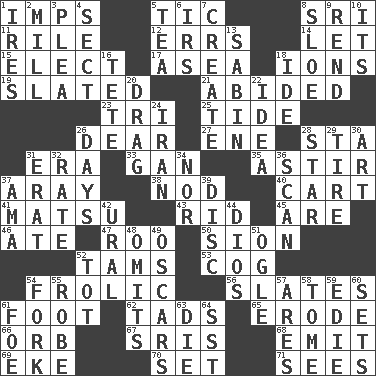 ACROSS 1. Naughty children 5. Nervous spasm 8. _ Lanka 11. Cause heat under the collar 12. Blunders 14. Allow 15. Voters do this 17. At sea 18. Charged particles 19. Scheduled 21. Stayed 23. Three (prefix) 25. Periodic rise and fall of the sea level 26. Letter starter 27. Compass dir. 28. R.R. building 31. Epoch 33. Separate the seeds from cotton 35. Moving or stirring 37. Like ___ of sunshine 38. Allow head to fall sleepily 40. Draw slowly or heavily 41. Taiwanese island in East China Sea 43. To free from 45. "We ___ not amused" (Victoria) 46. Had dinner 47. Friend of Pooh 50. The Jewish people; Israel 52. Scottish caps 53. Gear tooth 54. Play 56. Chalkboards 61. 12 inches 62. Small amounts or degrees 65. Eat (away) 66. Globe 67. Indian titles of respect 68. Send forth 69. Make supply last 70. Arrange properly for use 71. Observes DOWN 1. Angers 2. Place where flour is made 3. Entreaty 4. Religious group 5. Beverage made from leaves 6. Big collection agency 7. Make 8. A type of plum 9. Tear apart 10. ___ a Wonderful Life 13. Unit of acoustic absorption 16. False hair 18. Binary compound 20. To be drawn or hauled along 22. The main thing one is thinking about 24. SW Asia republic 26. 24-hour periods 28. Play the lead 29. Hoop that covers a wheel 30. Tate display 31. Part of Q.E.F. 32. Assign a rank or rating to 34. And not 36. Skim 37. Wet nurse (var.) 39. Plate 42. Mountain range 44. "Vaya con ____" 48. Leaves out 49. Motion picture awards 51. Stare at amorously 52. Small child 54. Tined utensil 55. Loose flowing garment 57. Ancient Greek god of war 58. Heavy book 59. Singer Brickell 60. Puts into a specified state 61. Enemy 63. Pass on 64. Fast jet (abbr.)