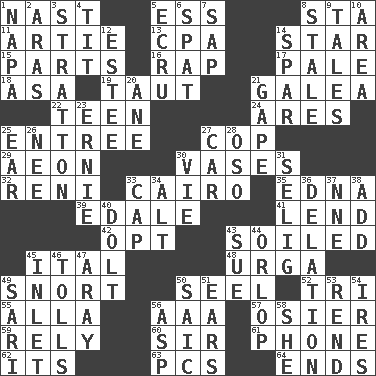 ACROSS 1. Political cartoonist Thomas 5. Curvy letter 8. R.R. building 11. Nick name for Arthur 13. Numbers guy (abbr.) 14. Play the lead 15. Actors' quests 16. Hit sharply and swiftly 17. Diluted with white 18. White ___ sheet 19. Pulled tight 21. An organ shaped like a helmet 22. Adolescent 24. Ancient Greek god of war 25. Main course 27. Police officer (slang) 29. Period of immesurable duration 30. Flower holders 32. Painter Guido (1575-1642) 33. Capital of Egypt 35. Pulitzer Prize-winning author Ferber 39. Peak District village in England 41. Grant temporary use of 42. Elect 43. Dirtied 45. Slanted text style (abbr.) 48. Capital and largest city of Mongolia 49. Derisive sound 50. Stitch closed the eyes of (a falcon) 52. Three (prefix) 55. Silent film actress Nazimova 56. Auto club (abbr.) 57. Flexible twig of a willow tree 59. Trust 60. Title for a knight 61. Give a jingle 62. It is 63. Personal Computers (abbr.) 64. Extremities DOWN 1. California wine valley 2. Caspian sea tributary 3. Ski resort town in Vermont 4. Teat (slang) 5. Shade of tan 6. Argument over a trivial matter 7. Plant excrement 8. Showing deterioration from age 9. Lies 10. Length times width 12. First name in cosmetics 14. Practice fight 20. A saturated hydrocarbon 21. Stare wonderingly 23. Bert's buddy 25. Hearing organ 26. Born 27. 4-wheeled motor vehicle 28. Bear (Spanish) 30. Compete 31. Former Milwaukee Brewers owner Bud 33. Head covering 34. Keyboard modifier key 36. Accusation by an informer 37. Compass dir. 38. Say or write further 40. Stupid person 43. Take to court 44. Lowest deck of a ship 45. An arm off of a larger body of water 46. For Whom the Bell _____ 47. Like ___ of sunshine 49. Indian skirt 50. Ketch in the Levant 51. Hearing organs 53. Tear apart 54. Angers 56. Viper 58. A female animal or person