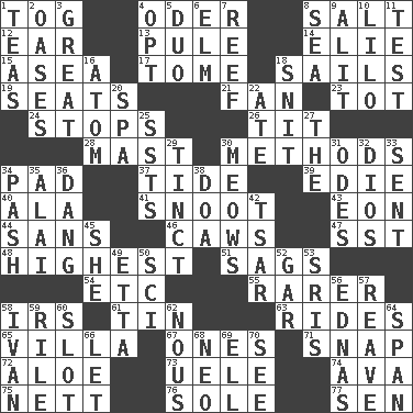 ACROSS 1. Coat; cloak 4. River in Europe 8. Table seasoning 12. Hearing organ 13. Whimper 14. Writer Wiesel 15. At sea 17. Heavy book 18. Travel by water 19. Theater features 21. Avid follower 23. Small child 24. Constricts 26. Teat (slang) 28. Vertical spar for supporting sails 30. Modes 34. Groovy apt. 37. Periodic rise and fall of the sea level 39. Singer Brickell 40. Chicken ___ king 41. Snob 43. Age 44. Without 46. Crow sounds 47. Fast jet (abbr.) 48. Having the greatest elevation 51. Settles 54. And so on (abbr.) 55. Less widely known 58. Big collection agency 61. Metal container 63. Amusement-park features 65. Country residence 67. Washington bills 71. Fastener 72. _ vera 73. Ubangi River tributary 74. Actress Gardner 75. Remaining after all deductions 76. Not divided or shared with others 77. Elected rep. DOWN 1. Afternoon social gatherings 2. Fertile tracts in a desert 3. Relatively large 4. Choose 5. Superhero pair 6. Shade tree 7. Coral collection 8. Ocean 9. Set down 10. _ and Stitch 11. Trial 16. Tiny particle 18. In a ____ (agitated or irritated) 20. Health resort 22. Had dinner 25. Fast planes 27. Definite Article 29. Tinged 30. Catcalls? 31. Lyric poems 32. "Vaya con ____" 33. Emitted 34. Romantic infatuation 35. Mountain range southwest of Kyrgyzstan 36. Mild oath, euphamism for damn 38. ___ good deed 42. Russian ruler of old 45. A female animal or person 49. Singer James 50. _-fi 52. Slender fish 53. Indian titles of respect 56. Ferber et al. 57. Rob, plunder, or pillage 58. "Terrible" tsar 59. Cause heat under the collar 60. Notch 62. Good sense 64. Connect, as a bridge 66. Allow 68. Modern: prefix 69. Pipe bend 70. Perceive with the eye