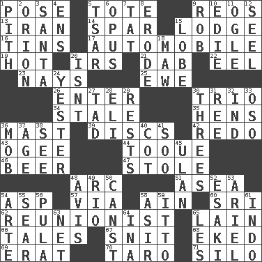 ACROSS 1. Airs 5. Lug 9. Vintage cars 13. SW Asia republic 14. Practice fight 15. Inn 16. Metal containers 17. Form of transportation 19. Being at a high temperature 20. Big collection agency 21. Pat or tap gently 22. Snakelike fish 23. Negative votes 25. She-sheep 26. Keyboard key 30. Musical group of three 34. Having lost freshness 35. Coop moms 36. Vertical spar for supporting sails 39. Plates 42. Redecorate 43. Double curve, resembling the letter S 44. Woman's close-fitting hat 46. Fermented drink made from hops 47. Fur scarf 48. Curve 51. Toward the sea 54. Viper 57. By way of 58. The 18th letter of the Arabic alphabet 60. Indian title of respect (Mr.) 62. One who advocates reunion 65. (Had) reclined 66. Falsehoods 67. In a ____ (agitated or irritated) 68. Supplemented with great effort 69. Part of Q.E.F. 70. Pacific island yam 71. Grain storage tower DOWN 1. Heart or essence 2. Constellation of myth 3. Before Barbara or Clara 4. Followers of ems 5. Russian ruler of old 6. Musical composition 7. Make lace 8. Eat (away) 9. Director Reiner 10. Singer Brickell 11. Stare 12. Stitch closed the eyes of (a falcon) 15. Ear part 18. Opening into something insatiable 20. Is not 24. Next before 27. Small amount or degree 28. Biblical high priest 29. Musical pauses 30. Threesomes 31. To separate or throw off 32. Indiana (abbr.) 33. Bear (Spanish) 36. Disorderly crowd 37. Ripen 38. Perceive with the eye 40. Small bed 41. "Barney Miller" actor Jack 45. ____ Bator 48. Deliberation 49. River (Sp.) 50. 2nd pers. sing. pres. of can (arch.) 52. 1973 Nobel Price Winner (Physics) Leo 53. Satellite of Uranus 54. Johnson of "Laugh-In" 55. Scorch 56. Monetary unit of Botswana 58. SW Saudi Arabia district 59. "Tell ____ the Marines!" 61. _ china 63. Fish or hair follower 64. _ tizzy (2 wds.) 65. French article