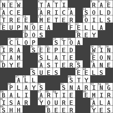 ACROSS 1. ___ Haven, CT 4. Jacques of French films 8. Actress Charlotte 11. Adept person 12. N. Chile seaport 14. Exchanged or delivered for money 15. Relationship diagram 17. Distance measurement 18. Lubricates 19. Normal relaxed breathing 21. Man or boy (slang) 23. Two (Sp.) 24. Marina Del _, California 25. Hoof sound 27. Portico 30. Retirement account (abbr.) 31. Oozed 34. Victory 37. Scottish cap 38. Chalkboard 39. A really long time 40. Color 41. Michaelmas daisies 43. One (Scot) 44. Institutes legal proceedings 45. Snakelike fish 47. 100% 49. Filthy place 50. Live dramatic performances 52. Catching in a trap 56. Indonesian resort city 57. Nick name for Arthur 60. Independent ruler or chieftain 61. Austrian river, tributary to the Danube 62. You are 63. Insect wing 64. Quiet! 65. Fermented drink made from hops 66. Consenting reply DOWN 1. Nathan's nickname 2. Shade of tan 3. Shed a tear 4. Makes less strong or intense 5. Length times width 6. Teat (slang) 7. Frozen water 8. Agitated, as a liquid 9. Silent film actress Nazimova 10. Begley and Asner 13. Sandy's bark 14. Flatfish 16. Inside; within (prefix) 20. I made a mistake 22. Epoch 25. Supercomputer manufacturer 26. Unable to walk 27. Arguments over trivial matters 28. False hair 29. Baltic tributary 30. It would 32. Son of Isaac 33. Otherwise 34. Welt 35. Charged particles 36. Compass dir. 42. Stalk of a moss capsule 44. Secret 46. Jane of fiction 47. Assad's deity 48. Den 49. Scornful expression 50. Romantic infatuation 51. Declare 52. Father 53. "If ____ say so..." 54. The longest river in the world 55. Pate de foie ____ 56. Again 58. Director Reiner 59. Third day of the wk.