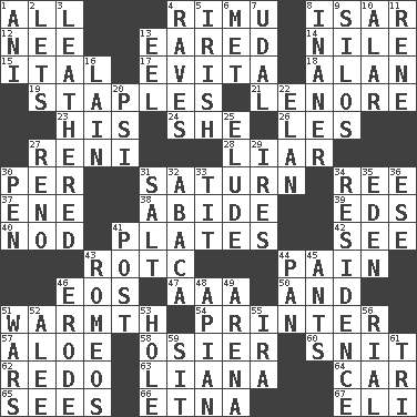 ACROSS 1. 100% 4. Tall New Zealand timber tree 8. Austrian river, tributary to the Danube 12. Born 13. Having ears or earlike features 14. "Death on the ____" 15. Slanted text style (abbr.) 17. Webber/Rice musical 18. Actor Alda or Thicke 19. Paper fasteners 21. Poe poem 23. Part of HMS, perhaps 24. A female animal or person 26. French article 27. Painter Guido (1575-1642) 28. One who doesn't tell the truth 30. For each 31. Titan orbits this 34. To sift 37. Compass dir. 38. Remain 39. Begley and Asner 40. Allow head to fall sleepily 41. Food holders 42. Observe 43. College mil. group 44. Ache 46. Greek goddess of the dawn 47. American Automobile Association (abbr.) 50. Also 51. Heat 54. Hard copy producer 57. _ vera 58. Flexible twig of a willow tree 60. In a ____ (agitated or irritated) 62. Make new 63. Woody, climbing, usually tropical plant 64. 4-wheeled motor vehicle 65. Perceives with the eye 66. Inactive volcano in Sicily 67. Connecticut Ivy Leaguer DOWN 1. Black tropical American cuckoo 2. Allows 3. Resembling or made to resemble leather 4. All-night dance parties 5. From or relating to Ireland 6. Was introduced to 7. Allodial 8. More empty; more void 9. Grain storage towers 10. Having or resembling wings 11. French philosopher Descartes 13. Snakelike fish 16. (Had) reclined 20. 23rd letter of the Greek alphabet 22. Style 25. Dodge 27. Former U.S. Attorney General Janet 29. Angers 30. Writing instrument 31. Table seasoning 32. Phillipine bananalike plant 33. Teat (slang) 34. Dwelling 35. Genesis locale 36. Compass dir. 41. Mail 43. Lover boys 44. Baking dish 45. Pismires 46. Wear away 48. Bee-related 49. Sports stadium 51. Armed conflicts 52. Toward shelter 53. Hollow 55. Retirement account (abbr.) 56. Monetary unit of Yemen 59. Be seated 61. Three (prefix)