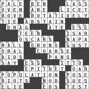 ACROSS 1. Diluted with white 5. Benjamin's nick name 8. Fails to keep up a pace 12. Baking chamber 13. "We ___ not amused" (Victoria) 14. It is permitted: Lat. 15. Be footloose 16. Happening in regular succession 19. Neckwear 20. Refrain by choice 21. To be drawn or hauled along 23. Had dinner 24. Compass dir. 27. Adolescent 30. Austrian river, tributary to the Danube 31. Motion picture awards 34. California wine valley 35. Promenade 38. U. of Maine site 40. Abrupt rush of wind 41. Spoken 42. Unrefined 44. Auction offers 45. Zero-star reviews 46. Declare 47. Curvy letter 50. "Tell ____ the Marines!" 53. Curse 57. Boat paddle 59. Census information 63. Introduce or present, as a question 64. Disturbances 65. Lower and raise head in agreement 66. Takes to court 67. Writer Wiesel 68. Begley and Asner 69. Trial DOWN 1. Left side of a ship or aircraft 2. Prevent the occurrence of 3. Prying instrument 4. Compass dir. 5. Sharp remark 6. Greek god of love 7. Remaining after all deductions 8. 54 in ancient Rome 9. Adept person 10. Set 11. Filthy place 14. Actor's bit 17. American Automobile Association (abbr.) 18. Teat (slang) 20. Eras 22. Ringlike coral islands and reefs 24. He sold his birthright 25. Plant excrements 26. Part of Q.E.F. 28. Environmental prefix 29. Drug cop 30. Swallow 32. Friend of Pooh 33. Fastener 35. Crowds into 36. Operatic vocal solo 37. Kenny Rogers chart-topper in '80 39. Mouth or opening 43. In a ____ (agitated or irritated) 47. Snakelike fish 48. Health resort 49. Be seated 51. Woman's close-fitting hat 52. Fertile tracts in a desert 54. Prong on a fork 55. Parka part 56. Extremities 58. Respite 59. Before (prefix) 60. Petroleum 61. Luau course 62. Shoshoni 63. Pacific Standard Time (abbr.)