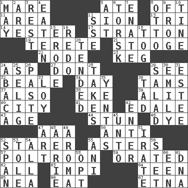 ACROSS 1. Female horse 5. Had dinner 8. Often (poetically) 11. Length times width 12. The Jewish people; Israel 13. Three (prefix) 14. Last past 17. Ski resort town in Vermont 19. Cylindrical with tapered ends 21. Moe Howard, for one 22. Thickened enlargement 23. Cask 24. Cleo's killer 27. Do not 29. Observe 32. Calif. Air Force Base 34. 24 hours 36. Scottish caps 37. In addition 38. Make supply last 39. Set down 40. Municipality 41. Lair 42. Peak District village in England 43. Mature 44. Astound 46. Color 47. Auto club (abbr.) 50. Opposed to 52. A viewer who gazes fixedly 55. Michaelmas daisies 57. Coward 59. Declaimed 62. 100% 63. Body of Kaffir warriors 64. Adolescent 65. Teachers' org. 66. Erode 67. Inactive volcano in Sicily DOWN 1. Fifth month 2. "We ___ not amused" (Victoria) 3. Repose 4. Consumed 5. Small island 6. Cod relative 7. Maternal 8. "Beetle Bailey" pooch 9. Toadlike animal 10. Prong on a fork 12. Compass dir. 15. Eat (away) 16. Redecorate 18. Coat; cloak 20. Watched over 24. Phillipine bananalike plant 25. Major League Baseball Commissioner Bud 26. Thick mixture 28. Proceeds 29. First course 30. Poet Dickinson 31. First name in cosmetics 33. Myrna of the movies 35. Gossips 36. Small amount or degree 42. Keyboard key 45. To (old English) 47. Tate display 48. Nest on high 49. Odor 51. Feeling or showing extreme anger 52. Connect, as a bridge 53. Lacquered or enameled metalware 54. Silent film actress Nazimova 55. Cuckoo 56. Proofreading order 58. Elect 60. Car or cant ending 61. Heredity factor (abbr.)
