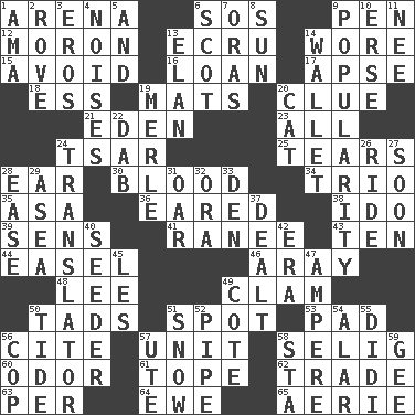 ACROSS 1. Sports stadium 6. Distress signal 9. Writing instrument 12. Person of subnormal intelligence 13. Shade of tan 14. Had on 15. Prevent from happening 16. Grant temporary use of 17. Domed church section 18. Double-curved letter 19. Floor protectors 20. A slight indication 21. Locale of original sin 23. 100% 24. Russian ruler of old 25. Separates forcefully 28. Ewer handle 30. Vital fluid 34. Musical group of three 35. White ___ sheet 36. Having ears or earlike features 38. Wedding promise 39. Elected reps. 41. Indian princess (variant) 43. "___ Little Indians" 44. Artist's stand 46. Like ___ of sunshine 48. Area sheltered from the wind 49. Burrowing marine mollusk 50. Small amounts or degrees 51. Blemish 53. Groovy apt. 56. Quote 57. A single undivided whole 58. Major League Baseball Commissioner Bud 60. Scent 61. Drink excessively 62. Buy and sell 63. For each 64. She-sheep 65. Nest on high DOWN 1. Housemaid (var.) 2. Be footloose 3. Greek god of love 4. Annoying sounds 5. Also 6. Highlander 7. Mouths or openings 8. Player for Phoenix 9. Teen's desire 10. Celtic language 11. Born 13. Enthusiasm 14. Place for singles 19. Haggard of country music 20. Domesticated feline 22. Small moist lump or mass 24. Interpreter 26. Travel on or in a vehicle 27. Within a short period 28. Relaxation 29. Toward the sea 31. Boat paddle 32. Mouth or opening 33. Lair 37. Started a card game 40. Sowing specialist 42. Epoch 45. French article 47. Electrical Unit 49. ____ d'Azur (French Riviera) 50. Periodic rise and fall of the sea level 51. Overwhelm 52. Corncob 54. Having or resembling wings 55. "You Light Up My Life" star Conn 56. Police officer (slang) 57. Shoshoni 58. R.R. building 59. Unit of force equal to gravity