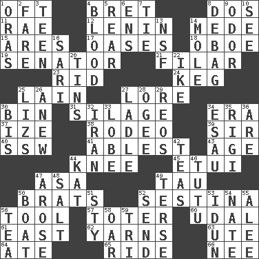 ACROSS 1. Often (poetically) 4. Cy Young winner Saberhagen 8. Two (Sp.) 11. Actress Charlotte 12. Soviet premier 1918-24 14. Ancient Persian 15. Ancient Greek god of war 17. Fertile tracts in a desert 18. Mitch Miller's instrument 19. Elected representative 21. Having threads 23. To free from 24. Barrel 25. (Had) reclined 27. Old wives' tales, e.g. 30. Storage container 31. Fodder prepared in a silo 34. Epoch 37. Ending with capital 38. Cowboy competition 39. Title for a knight 40. Compass dir. 41. Most capable 43. Ripen 44. Leg joint 45. Needle holder 47. White ___ sheet 49. The 19th letter of the Greek alphabet 50. Naughty children 52. French poetic form 56. Implement 57. Carrier 60. Hereditary estate 61. Compass direction 62. Entertaining tales 63. Shoshoni 64. Had dinner 65. Travel on an animal 66. Born DOWN 1. Mouths or openings 2. Conductor's collection 3. Adolescent 4. Vital fluid 5. Tail end 6. Followers of ems 7. Make a knot 8. Debunk (Brit. slang) 9. Scent 10. Observe 13. Science/research agcy. 14. Undercover agent 16. Indian skirt 20. Metal containers 22. Mamie's mate 25. Belonging to Elizabeth 26. Afresh 27. Dipping utensil 28. Double curve, resembling the letter S 29. Vintage cars 30. Altar cloth linen 32. SW Asia republic 33. Ear part 34. Son of Isaac 35. Swiss mountan, "Queen of the Mountains" 36. "We ___ not amused" (Victoria) 42. Afternoon social gatherings 44. Krazy ___ of comics 46. Ballerina skirt 47. Came up 48. Table seasoning 49. Laconic 50. Water vessel 51. Filthy place 52. Transmit 53. Goddess of spring and wife of Bragi 54. Nathan's nickname 55. Toward shelter 56. Afternoon social gathering 58. Rowing implement 59. Three (prefix)