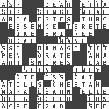 ACROSS 1. Viper 4. Letter starter 8. Singer James 12. Title for a knight 13. Scorch 14. Actress Patricia 15. Type of rug 17. _____ Park, CO 18. Through, poetically 19. Core 21. Cylindrical with tapered ends 23. Mamie's husband 24. _ Lanka 26. Portuguese money of account (variant) 27. Freehold land 28. Raze (variant) 30. Compass dir. 31. Break 34. Teat (slang) 37. Animal enclosure 38. Speak pompously 39. Wet nurse (var.) 40. Nonscientific branch of learning 41. Sounds asleep 42. Experiment locale 43. Arranges properly for use 44. Inwardly 46. Pass on 47. Curvy letter 50. Domesticated feline 51. Ringlike coral islands and reefs 54. Leopard's kin 57. California wine valley 58. Acquire or gain knowledge or skills 60. Writer Wiesel 62. Cassini of fashion 63. Stared 64. Begley and Asner 65. Land measure 66. Mild oath 67. Perceive with the eye DOWN 1. White ___ sheet 2. Title for a man of rank and authority 3. Elected leader of a country 4. Plates 5. Keyboard key 6. Grow older 7. Relief 8. Main course 9. Giggle 10. Small pie 11. _ vera 13. Elected rep. 16. "____ silly question..." 20. Snakelike fish 22. Celtic language 25. Feeling or showing extreme anger 27. One who makes use of a thing 29. Ripens 30. Health resort 31. Do not 32. Came up 33. Spoil 34. Baron Munchausen's specialties 35. "If ____ say so..." 36. Bar bill 41. Sew up the eyelids of hawks and falcons 43. Fodder prepared in a silo 44. Frozen water 45. Nathan's nickname 46. Drug addict 48. Any of the three canals of the cochlea 49. Tear up 51. Small Philippine buffalo 52. Baby powder 53. _ gin 55. Conclude 56. Flintstone garb 59. Ovum 61. Compass dir.