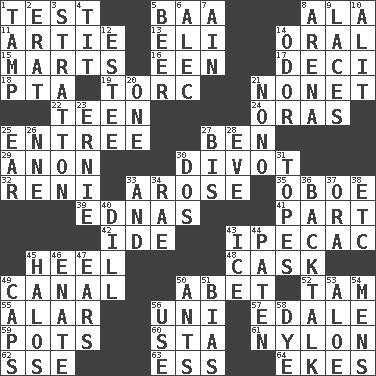ACROSS 1. Trial 5. Sound made by sheep 8. Chicken ___ king 11. Nick name for Arthur 13. Biblical high priest 14. Taken by mouth 15. Shops 16. Car or cant ending 17. Tenth: prefix 18. Parent Teacher Association (abbr.) 19. Torque (variant) 21. Music written for nine 22. Adolescent 24. Mouths or openings 25. Main course 27. Benjamin's nick name 29. At once, immediately (arch.) 30. A piece of turf (Scot.) 32. Painter Guido (1575-1642) 33. Came up 35. Mitch Miller's instrument 39. Ferber et al. 41. Role in a play 42. Binary compound 43. Medicinal drug used to evoke vomiting 45. The bottom of a shoe or boot 48. Keg 49. Lessep's creation 50. Collude with 52. Scottish cap 55. Having or resembling wings 56. University (slang) 57. Peak District village in England 59. Plant holders 60. R.R. building 61. High-strength synthetic material 62. Compass dir. 63. Double-curved letter 64. Supplements with great effort DOWN 1. Pack (down) 2. Part of Q.E.F. 3. Ski resort town in Vermont 4. Teat (slang) 5. Fermented drink made from hops 6. Actor Baldwin 7. The 18th letter of the Arabic alphabet 8. Sports stadium 9. Shoestrings 10. Came down and settled, as after flight 12. First name in cosmetics 14. Scent 20. Single 21. Words to Nanette 23. Bert's buddy 25. Hearing organ 26. Compass dir. 27. Twice 28. Night before a holiday 30. Two (Sp.) 31. Drinks excessively 33. Added to 34. Actress Charlotte 36. Sass 37. Mouth or opening 38. And so on (abbr.) 40. Deli pickle 43. Frozen water 44. Eucharist need 45. Auras 46. Related on the mother's side 47. Hearing organs 49. Balmoral and tarboosh 50. Pismires 51. Prejudice 53. _ vera 54. Not women's 56. Purpose 58. Color