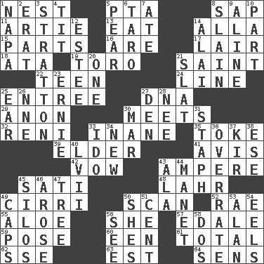 ACROSS 1. Egg locale 5. Parent Teacher Assoc. 8. Plant excrement 11. Nick name for Arthur 13. Erode 14. Silent film actress Nazimova 15. Components 16. "We ___ not amused" (Victoria) 17. Den 18. _ moment's notice (2 wds.) 19. "Corrida" creature 21. Inhabitant of Heaven 22. Adolescent 24. Actor's bit 25. Main course 27. Heredity factor (abbr.) 29. Soon (poet.) 30. Confronts 32. Painter Guido (1575-1642) 33. Silly 35. Casino tip 39. A person who is older than you are 41. Advice 42. Solemn pledge 43. Electrical Unit 45. Suttee (variant) 48. Cowardly lion portrayer 49. High-altitude cloud 50. Skim 52. Actress Charlotte 55. _ vera 56. A female animal or person 57. Peak District village in England 59. Airs 60. Car or cant ending 61. Add up to 62. Compass dir. 63. Eastern Standard Time (abbr.) 64. Elected reps. DOWN 1. California wine valley 2. Part of Q.E.F. 3. Ski resort town in Vermont 4. Teat (slang) 5. Lightbulb-shaped fruit 6. Pacific island yam 7. Had dinner 8. Killed 9. Place in a line 10. Piece 12. First name in cosmetics 14. Mountain range southwest of Kyrgyzstan 20. Single 21. Narrow board 23. Bert's buddy 25. Hearing organ 26. Compass dir. 27. Lair 28. Born 30. Make imperfect 31. Staphylococcus 33. Wedding promise 34. ___ Haven, CT 36. Make much ado about nothing 37. Apertif with cassis 38. Compass dir. 40. 57 in ancient Rome 43. According to 44. French painter Edouard 45. Grain storage towers 46. Came up 47. Woody plant 49. Balmoral and tarboosh 50. "______ My Girl" (Turtles hit) 51. Penny 53. Actor Alda or Thicke 54. Snakelike fish 56. Perceive with the eye 58. Two (Sp.)