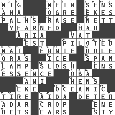 ACROSS 1. Russian fighter aircraft 4. Chow _ 8. Elected reps. 12. Housemaid (var.) 13. Legendary monster 14. Makes supply last 15. Insides of hands 18. To erase 19. Remaining after all deductions 20. Had a strong desire 22. Possessed 23. Roberta Peters solo 24. Large container 25. Eastern Standard Time (abbr.) 26. Manned the helm 30. Floor protector 33. Bert's buddy 36. Hero or heavy, e.g. 37. Mouths or openings 39. Frozen water 40. Connect, as a bridge 41. Desk light 42. Agitate, as a liquid 44. Followers of ems 45. Core 47. Chief or king in Benin or Nigeria 50. Black tropical American cuckoo 51. Not women's 53. Make supply last 54. Pertaining to the sea 57. Hoop that covers a wheel 59. Opera by Verdi 61. Prevent from occurring 63. The sixth month of the Jewish calendar 64. Riding implement 65. Compass dir. 66. Wagers 67. Hearing organs 68. Filthy place DOWN 1. Atlas unit 2. "If ____ say so..." 3. An organ shaped like a helmet 4. Greater amount 5. Mild oath 6. Big collection agency 7. Born 8. Legislators 9. Supplemented with great effort 10. Fish or hair follower 11. Fast jet (abbr.) 16. Female horse 17. Indian titles of respect 21. Nathan's nickname 22. Actor Linden 24. Compete 26. Sliced desserts 27. Drink excessively 28. Style 29. Cub Scout units 30. Undercover agent 31. Ancient river in northeast Turkey 32. Scottish caps 34. Cause heat under the collar 35. Non-commissioned officer (abbr.) 38. Orators 42. _-fi 43. Dwelling 46. Compass dir. 48. Necklace unit 49. Queen of England 1702-14 52. Settings 53. Part of Q.E.F. 54. Scent 55. Smile enhancers 56. Penny 57. Bar bill 58. Binary compound 59. Adept person 60. Retirement account (abbr.) 62. Marina Del _, California