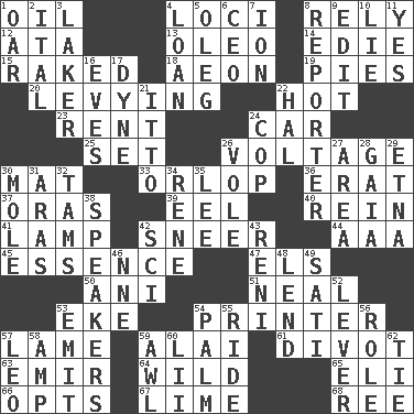ACROSS 1. Lubricate 4. Event scenes 8. Have trust in 12. "One Day ___ Time" 13. Butter sub 14. Singer Brickell 15. Swept the length of 18. Period of immesurable duration 19. Sliced desserts 20. Imposing or collecting, as a tax 22. Being at a high temperature 23. Monthly bill 24. Auto 25. Put into a specified state 26. Electrical Measurement 30. Floor covering 33. Lowest deck of a ship 36. Part of Q.E.F. 37. Mouths or openings 39. Snakelike fish 40. It's straight from the horse's mouth 41. Desk light 42. Scornful expression 44. Auto club (abbr.) 45. Core 47. Raised railways 50. Cuckoo 51. Anneal 53. Supplement with great effort 54. Hard copy producer 57. Unable to walk 59. Mountain range southwest of Kyrgyzstan 61. A piece of turf (Scot.) 63. Independent ruler or chieftain 64. Rampant 65. Biblical high priest 66. Chooses 67. Welles in "The Third Man" 68. To separate or throw off DOWN 1. Boat paddle 2. Slanted text style (abbr.) 3. Member of a famous L.A. basketball team 4. Grant temporary use of 5. Cassini of fashion 6. Corporate head (abbr.) 7. Electrically charged atom 8. Newsperson 9. Prepare for publication 10. Untruth 11. It is so 16. Nights before holidays 17. Centimeter-gram-second unit of force 21. "Tell ____ the Marines!" 22. Actor Linden 24. Police officer (slang) 26. Short-tailed, large-bodied rat 27. Length times width 28. Greek goddess of the earth (variant) 29. Inactive volcano in Sicily 30. Undercover agent 31. Ancient river in northeast Turkey 32. Scottish caps 34. French philosopher Descartes 35. Area sheltered from the wind 38. Orators 42. _-fi 43. Painter Guido (1575-1642) 46. Compass dir. 48. Grant temporary use of 49. Suttee (variant) 52. Crowbar 53. Send forth 54. Inside of hand 55. Travel on an animal 56. Hero or heavy, e.g. 57. Lion 58. Electrical Unit 59. Leather borer 60. Cards in a Roman deck? 62. Neckwear
