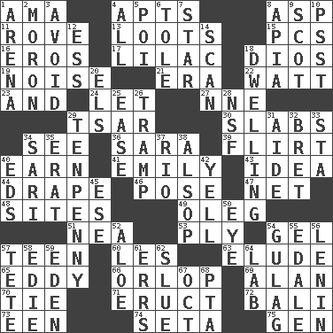 ACROSS 1. Housemaid (var.) 4. Flats, for short 8. Cleo's killer 11. Be footloose 13. Plunders 15. Personal Computers (abbr.) 16. Greek god of love 17. Pale purple color 18. "Vaya con ____" 19. Annoying sound 21. Period 22. Electrical Unit 23. Plus 24. Allow 27. Compass dir. 29. Russian ruler of old 30. Thick slices 34. Perceive with the eye 36. "Two Mules for Sister ____" 39. Seductive woman who exploits men 40. Merit 41. Poet Dickinson 43. The content of cognition 44. Window treatment 46. Airs 47. Fish or hair follower 48. Locates 49. Cassini of fashion 51. Teachers' org. 53. Apply oneself diligently 54. Set 57. Adolescent 60. French article 63. Dodge 65. Whirlpool 66. Lowest deck of a ship 69. ____ Jay Lerner 70. Make a knot 71. Spew [out] 72. Indonesian resort city 73. Car or cant ending 74. Bristle 75. Commissioned military rank (abbr.) DOWN 1. Sports stadium 2. Person of subnormal intelligence 3. Keep away from 4. 100% 5. Luau course 6. Lacquered or enameled metalware 7. Play the lead 8. Capital of Western Samoa 9. Native of Scotland 10. Inconspicuous attention getter 12. Curvy letter 14. Glance over 18. Home 20. Raised railways 25. Comfort 26. _____ steamer (cargo ship) 28. Science/research agcy. 29. 3-inch nail 31. Helper 32. Cy Young winner Saberhagen 33. R.R. building 34. Indian skirt 35. Part of Q.E.F. 37. _ de Janeiro 38. Columnist Joseph or Stewart 40. Begley and Asner 42. Shout 45. Compass dir. 50. Sight organ 52. _ vera 54. Russian prison camp 55. Peak District village in England 56. Soviet premier 1918-24 57. Wig 58. Singer Brickell 59. Genesis locale 61. Blunders 62. Change direction abruptly 64. Experiment locale 67. Sep. follower 68. Parent Teacher Association (abbr.)