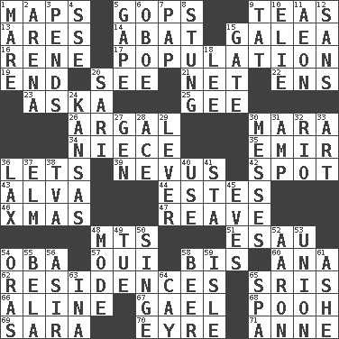 ACROSS 1. Atlas contents 5. Republicans 9. Afternoon social gatherings 13. Ancient Greek god of war 14. Blind as ____ 15. An organ shaped like a helmet 16. French philosopher Descartes 17. Census information 19. Conclude 20. Perceive with the eye 21. Fish or hair follower 22. Followers of ems 23. "____ silly question..." 25. Unit of force equal to gravity 26. Therefore, facetiously 30. Hindu Mythology: god of death 34. Sibling's daughter 35. Independent ruler or chieftain 36. Allows 39. Congenital growth or mark on the skin 42. Blemish 43. Inventor's middle name 44. _____ Park, CO 46. Dec. holiday 47. Rob, plunder, or pillage 48. Mountains (abbr.) 51. He sold his birthright 54. Chief or king in Benin or Nigeria 57. Fr. "Yes" 58. Altar cloth linen 60. Santa ___, CA 62. Dwellings 65. Indian titles of respect 66. Place in a line 67. Highlander 68. "Silly old bear" 69. "Two Mules for Sister ____" 70. Jane of fiction 71. Singer Murray DOWN 1. Female horse 2. Sports stadium 3. Hangs 4. Compass dir. 5. Open wide 6. Mitch Miller's instrument 7. Infant food 8. Feeling sharp psychological pain 9. Make lace 10. Writer Wiesel 11. Period of immesurable duration 12. Without 15. Yard entry 18. Area sheltered from the wind 20. Indian skirt 24. Sunflower state 27. Commissioned military rank (abbr.) 28. Adept person 29. Crowbar 30. Makes clutter 31. Electrical Unit 32. _ de Janeiro 33. Tate display 36. Not strict 37. Shade tree 38. Federal power corp. 40. Purpose 41. R.R. building 45. Nights before holidays 48. Method 49. Third day of the wk. 50. Burn superficially 52. Composer Copland 53. The state of being joined or united 54. Mouths or openings 55. Actor Lugosi 56. SW Saudi Arabia district 58. Fermented drink made from hops 59. Small island 61. American tennis player Robert 63. _ tizzy (2 wds.) 64. Island 65. Health resort