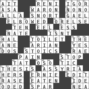 ACROSS 1. Small island 4. Painter Guido (1575-1642) 8. Russian composer Stravinsky 12. White ___ sheet 13. Make _____ (do battle with) 14. Words to Nanette 15. Silent film actress Nazimova 17. Derisive sound 18. Highlander 19. Turned at an angle; bent 21. Threatening words 23. Nine, plus one 24. Snakelike fish 26. Double-curved letter 27. Nathan's nickname 28. Is not 30. Actor Linden 31. Rest room 34. Definite Article 37. A saturated hydrocarbon 38. Believer in; advocate of (suffix) 39. Consenting reply 40. Two (Sp.) 41. Unemotional ones 42. Actress Charlotte 43. Ache 44. Constrict 46. Make lace 47. Bear (Spanish) 50. Nervous spasm 51. College paper 54. Nineveh was its capital 57. Possessive pronoun 58. Bert's buddy 60. Prepare for publication 62. To erase 63. Eroded 64. Binary compound 65. Wrote a lyric poem 66. Practice fight 67. Teachers' org. DOWN 1. Auto club (abbr.) 2. Small island 3. Baron Munchausen's specialties 4. Indian princess (variant) 5. Wear away 6. Not either 7. To the inside or interior of 8. Eat 9. Scores awarded for successful feats 10. Washington bills 11. Hero or heavy, e.g. 13. Compass dir. 16. Collude with 20. Single 22. Monthly bill 25. Pale purple color 27. Billionth: prefix 29. Elected reps. 30. Possessed 31. Jacques of French films 32. U. of Maine site 33. One more than two 34. Polypeptide antibiotic 35. Pile 36. Compass dir. 41. Suttee (variant) 43. Went by 44. Filthy place 45. Hoop that covers a wheel 46. Laconic 48. Before Barbara or Clara 49. Flexible twig of a willow tree 51. Through, poetically 52. Froth on beer 53. Observes 55. Elected rep. 56. Helper 59. Reproach for some lapse or misdeed 61. Beverage made from leaves