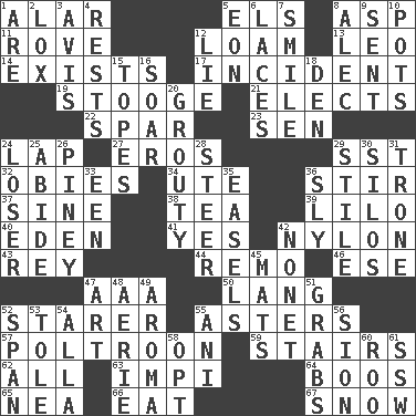 ACROSS 1. Having or resembling wings 5. Raised railways 8. Cleo's killer 11. Be footloose 12. Rich soil 13. Lion 14. Is 17. Happening 19. Moe Howard, for one 21. Chooses 22. Coast Guard woman 23. Elected rep. 24. Infant locale 27. Greek god of love 29. Fast jet (abbr.) 32. Off-Broadway awards 34. Shoshoni 36. Tumult 37. Trig term 38. Afternoon social gathering 39. _ and Stitch 40. Paradise 41. Affirmative reply 42. Thermoplastic polyamide 43. Marina Del _, California 44. San ____ (Riviera town) 46. Compass dir. 47. American Automobile Association (abbr.) 50. Long (Scottish) 52. A viewer who gazes fixedly 55. Michaelmas daisies 57. Coward 59. Flight of steps 62. 100% 63. Body of Kaffir warriors 64. Expressions of contempt or scorn 65. Teachers' org. 66. Ingest 67. Frozen precipitation DOWN 1. "We ___ not amused" (Victoria) 2. Brine-cured salmon 3. Opinion 4. Musical pauses 5. Period of immesurable duration 6. Shoestrings 7. Grin 8. Actor Baldwin 9. Emitted 10. Cooking vessels 12. Untruth 15. Drinks excessively 16. Fly high 18. Lair 20. Sulky 24. Failure 25. Remain 26. Abounding in pines 28. Bull 29. Vertical member of a panel or frame 30. Grain storage towers 31. Heavy duty weighing machine 33. Car or cant ending 35. Artist's stands 36. Secret 42. Music written for nine 45. Floor coverings 47. Tate display 48. Nest on high 49. Odor 51. Seizes 52. Connect, as a bridge 53. Lacquered or enameled metalware 54. Silent film actress Nazimova 55. Cuckoo 56. The Jewish people; Israel 58. Choose 60. Friend of Pooh 61. Compass dir.