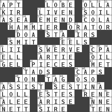 ACROSS 1. Fitting 4. Ear part 8. Water jar 12. Apertif with cassis 13. Make or become more lively 14. Earth 15. Toward the sea 17. Make improvements or corrections to 18. Root beer relative 19. More given to overacting 21. Speaker 23. ___ good deed 24. R.R. building 26. Big collection agency 27. Stricken, poetically 28. Snakelike fish 30. Cards in a Roman deck? 31. Turn aside suddenly 34. Accounting whiz (abbr.) 37. Pipe bend 38. Nick name for Arthur 39. Lubricate 40. Set 41. Components 42. Was introduced to 43. Small boys 44. Smile enhancers 46. Electrically charged atom 47. Label 50. Bear (Spanish) 51. Aid 54. French poetic form 57. Hang loosely or laxly 58. _____ Park, CO 60. French philosopher Descartes 62. Toward shelter 63. Get up 64. Compass dir. 65. Remaining after all deductions 66. Male parent of an animal 67. Nine, plus one DOWN 1. Alias (abbr.) 2. Expression of disdain 3. Excercise machine 4. Citrus fruits 5. Unconcealed 6. Benjamin's nick name 7. Inside; within (prefix) 8. Motion picture awards 9. Plunders 10. _ and Stitch 11. Having or resembling wings 13. Flowery wreath 16. Mine, in Marseilles 20. Floor protector 22. Cause heat under the collar 25. Nest on high 27. Filth; sediment 29. Nights before holidays 30. Part of a journey 31. Alleged 32. Take or capture by force 33. And so on (abbr.) 34. Part 35. Sliced desserts 36. Keyboard modifier key 41. Baking dishes 43. Bathroom plumbing fixture 44. Small bed 45. SW Saudi Arabia district 46. Small island 48. Moving about 49. Honkers 51. ____ Jay Lerner 52. Not divided or shared with others 53. Beverages made from leaves 55. Compass dir. 56. Queen of England 1702-14 59. Indian title of respect (Mr.) 61. Car or cant ending