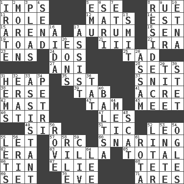ACROSS 1. Naughty children 5. Compass dir. 8. Sorrow 11. Hero or heavy, e.g. 12. Floor protectors 14. Eastern Standard Time (abbr.) 15. Sports stadium 17. Gold (Symbol: Au) 18. Elected rep. 19. Sycophants 21. One more than two 22. Retirement account (abbr.) 23. Followers of ems 24. Two (Sp.) 25. Small boy 27. Black tropical American cuckoo 28. Puts into a specified state 31. Pile 35. Fast jet (abbr.) 37. In a ____ (agitated or irritated) 38. Celtic language 39. Bar bill 41. Measure of real estate 42. Vertical spar for supporting sails 43. Scottish cap 45. Confront 46. Commotion 47. French article 49. Title for a knight 51. Nervous spasm 52. Lion 55. Allow 57. The grampus (Milton) 60. Catching in a trap 62. Period 63. Country estate 65. "_____ Recall" 66. Metal container 67. Writer Wiesel 68. Wig 69. Put into a specified state 70. Night before a holiday 71. Ancient Greek god of war DOWN 1. Feeling or showing extreme anger 2. Person of subnormal intelligence 3. Entreaties 4. Post 5. Australian flightless bird 6. Indian skirt 7. Needle case 8. Home 9. One who uses or employs something 10. Inactive volcano in Sicily 13. Stricken, poetically 16. Opera by Verdi 17. Help 20. Immeasurably long periods of time 26. Indian state 29. Become fatigued 30. Proofreading order 31. Cloth borders 32. Part of Q.E.F. 33. Helper 34. _ dish (used to culture cells) 36. Make lace 40. Greek mezzo-soprano Agnes 44. Chow _ 48. Get outta here! 50. Be footloose 52. 61 cubic inches 53. Related on the mother's side 54. Stares at amorously 55. Allows 56. One of the Great Lakes 58. Cause heat under the collar 59. 154 in Roman numerals 61. Roll call or roster of names 64. Area sheltered from the wind