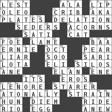 ACROSS 1. For fear that 5. Wing 8. Mouth edge 11. Butter sub 12. Baby bed with high sides 13. Alias (abbr.) 14. Food holders 17. Conveyance 19. Spring feasts 21. Oak nuts 22. Suttee (variant) 23. Feline 24. Enemy 27. Unable to walk 29. Sound made by sheep 32. Bert's buddy 34. Sep. follower 36. Lightbulb-shaped fruit 37. One who doesn't tell the truth 38. "Barney Miller" actor Jack 39. Indian skirt 40. Globular water bottle used in Asia 41. Connecticut Ivy Leaguer 42. Grain storage towers 43. One (Scot) 44. Liveliness 46. Compass dir. 47. ___ a Wonderful Life 50. Greek god of love 52. Poe poem 55. A viewer who gazes fixedly 57. Lacking a tonal center or key 59. Put through a sieve 62. Attila the _ 63. South Vietnam president (1954) 64. Travel on an animal 65. _ de Janeiro 66. Oval reproductive body of a fowl 67. Afresh DOWN 1. Chop off 2. Pipe bend 3. Oceans 4. Hauls 5. "We ___ not amused" (Victoria) 6. Pale purple color 7. Phillipine bananalike plant 8. Den 9. Visual representation of an object 10. Zero-star reviews 12. Music discs 15. Peak District village in England 16. Bristle 18. Small child 20. Full of chinks, cracks, or crevices 24. Chap (slang) 25. Constellation of myth 26. Related on the mother's side 28. Learning spot: Fr. 29. Calif. Air Force Base 30. Composer Copland 31. Get up 33. Lyricist Gershwin 35. Bathroom 36. 23rd letter of the Greek alphabet 42. Derisive sound 45. Caspian sea tributary 47. Electrically charged atom 48. Barter 49. Major League Baseball Commissioner Bud 51. Spanish missionary in California 52. Cowardly lion portrayer 53. Needle case 54. Words to Nanette 55. Symbol (abbr.) 56. Water falling in drops from the sky 58. Part of a journey 60. Binary compound 61. ___ Haven, CT
