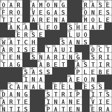 ACROSS 1. Rowing implement 4. Amid 9. Raze (variant) 13. From 14. Viva Las _ 15. Singles 16. Nervous spasm 17. Sports stadium 18. Undercover agent 19. Alias (abbr.) 21. Lion 22. Archer's quiver 24. Celtic language 26. Nilotic language 27. Observe 29. Without 30. Ascend 31. "Change" in Tahitian 33. Sep. follower 36. Nine, plus one 37. Catching in a trap 40. Indian title of respect (Mr.) 41. Label 42. Collude with 43. Moving or stirring 45. Backtalk 47. Cadet 48. _ tizzy (2 wds.) 49. Period of immesurable duration 50. Lessep's creation 52. Snakelike fish 54. Curvy letter 56. Mild oath, euphamism for damn 57. Remove all contents or possession from 59. ___ a Wonderful Life 61. Johnson of "Laugh-In" 62. Empty; void 63. Compete 64. Nuclear Threat Initiatives 65. Eucharist need 66. Period DOWN 1. Often (poetically) 2. Roberta Peters solo 3. Shooting up abruptly 4. Actress Gardner 5. Haggard of country music 6. Double curve, resembling the letter S 7. Billionth: prefix 8. Girls' org. (abbr.) 9. Lover boys 10. Small Philippine buffalo 11. Automatically 12. Compass dir. 20. Arches 22. Killed 23. Attila the _ 25. "______ My Girl" (Turtles hit) 27. Electrical Unit 28. Type of rug 29. Set or collection 31. Bar bills 32. "We ___ not amused" (Victoria) 33. Clearly or manifestly demonstrative 34. Baby bed with high sides 35. Hoop that covers a wheel 38. Rhinal 39. Stare wonderingly 44. _ gin 45. Scorches 46. Santa ___, CA 49. Place in a line 50. Haul 51. Against 52. Inactive volcano in Sicily 53. Part of Q.E.F. 55. Use a swizzle stick 56. Daniel's nick name 57. Small drink 58. Writing instrument 60. Ocean