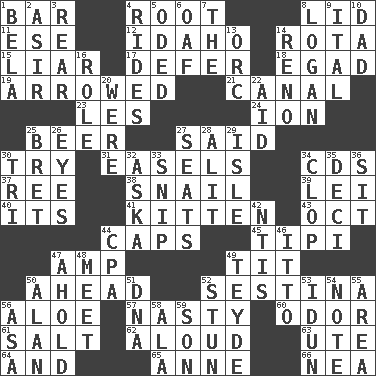 ACROSS 1. Soap unit 4. Carrot, for example 8. Hat (slang) 11. Compass dir. 12. Potato state 14. Roll call or roster of names 15. One who doesn't tell the truth 17. Postpone 18. Mild oath 19. Moved like an arrow 21. Lessep's creation 23. French article 24. Electrically charged atom 25. Fermented drink made from hops 27. Stated 30. Attempt to accomplish something 31. Artist's stands 34. Music discs 37. To sift 38. Slow-paced one 39. Flowery wreath 40. ___ a Wonderful Life 41. Baby cat 43. Sep. follower 44. Smile enhancers 45. Native american tent (variation) 47. Electrical Unit 49. Teat (slang) 50. At or in the front 52. French poetic form 56. Medicinal plant 57. Difficult 60. Aroma 61. Table seasoning 62. Verbally 63. Shoshoni 64. Also 65. Queen of England 1702-14 66. Teachers' org. DOWN 1. Actor Lugosi 2. SW Saudi Arabia district 3. Hitchcock's "____ Window" 4. Amusement-park features 5. Wrote a lyric poem 6. Clumsy lout 7. Definite Article 8. Utah city north of Ogden 9. Slanted text style (abbr.) 10. Male parent 13. The grampus (Milton) 14. Western Nevada city 16. Hero or heavy, e.g. 20. Past tense of be (plural) 22. Assist 25. Cy Young winner Saberhagen 26. Snake ____ (dice throw) 27. Theater features 28. Came down and settled, as after flight 29. Capri or Wight 30. Three (prefix) 32. "____ silly question..." 33. Sever or remove by pinching or nipping 34. Hoof sound 35. Tenth: prefix 36. Be seated 42. Nuclear Threat Initiatives 44. Tax preparer (abbr.) 46. "Tell ____ the Marines!" 47. Hold, grip (Informal) 48. Confront 49. Miss Universe 1986, Barbara Palacios _ 50. Actor Alda or Thicke 51. Heredity factor (abbr.) 52. Surprise greatly 53. Goddess of spring and wife of Bragi 54. Short letter 55. Length times width 56. White ___ sheet 58. Chicken ___ king 59. Manchild