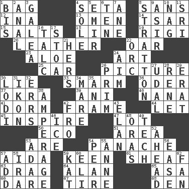 ACROSS 1. Paper or plastic container 4. Stalk of a moss capsule 8. Without 12. _ tizzy (2 wds.) 13. Presage 14. Russian ruler of old 15. Table seasonings 18. Actor's bit 19. Swiss mountan, "Queen of the Mountains" 20. Cordwainer's material 22. Rowing implement 23. Medicinal plant 24. Nonscientific branch of learning 25. Auto 26. Photo 30. Whopper 33. Excessive but superficial compliments 36. Baltic tributary 37. Gumbo ingredient 39. Black tropical American cuckoo 40. Grandmother 41. Dormintory (informal) 42. Movie unit 44. Allow 45. Stimulate to action 47. Car dealer's back yard 50. Environmental prefix 51. Type of rug 53. "We ___ not amused" (Victoria) 54. Flamboyance 57. Opera by Verdi 59. Peachy ____! 61. Archer's quiver 63. To draw with force 64. ____ Jay Lerner 65. White ___ sheet 66. Have the gumption 67. Hoop that covers a wheel 68. Lair DOWN 1. Twice 2. Of or related to the anus 3. An organ shaped like a helmet 4. Not divided or shared with others 5. Independent ruler or chieftain 6. "___ Little Indians" 7. One (Scot) 8. Ski resort town in Vermont 9. SW Saudi Arabia district 10. Tired old horse 11. _ Lanka 16. Baby powder 17. Portico 21. Possessive pronoun 22. The grampus (Milton) 24. Direct toward a target or goal 26. Demure 27. Allodial 28. French philosopher Descartes 29. Part of Q.E.F. 30. Farming town in central California 31. Visual representation of an object 32. Blunders 34. Female horse 35. Santa ___, CA 38. Electrical Measurement 42. From 43. Style 46. Frozen water 48. Mouths or openings 49. Technology 52. Forward in time 53. The sixth month of the Jewish calendar 54. Lightbulb-shaped fruit 55. Queen of England 1702-14 56. Relaxation 57. Increase 58. Retirement account (abbr.) 59. Krazy ___ of comics 60. Biblical high priest 62. Avid follower