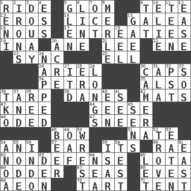 ACROSS 1. Travel on or in a vehicle 5. Seize upon or latch onto something 9. False hair 13. Greek god of love 14. Louse (plural) 15. An organ shaped like a helmet 16. Common sense 17. Pleas 19. _ tizzy (2 wds.) 20. A saturated hydrocarbon 21. Area sheltered from the wind 22. Compass dir. 23. Synchronize (abbr.) 25. Pipe bend 26. Satellite of Uranus 30. Smile enhancers 34. Stone: prefix 35. In addition 36. Canvas cover 39. Natives or inhabitants of Denmark 42. Floor protectors 43. Leg joint 44. Honkers 46. Wrote a lyric poem 47. Scornful expression 48. Ribbon knot 51. Nathan's nickname 54. Black tropical American cuckoo 57. Hearing organ 58. It is 60. Actress Charlotte 62. Unrelated to defense, as in spending 65. Globular water bottle used in Asia 66. More peculiar 67. Oceans 68. Nights before holidays 69. A really long time 70. Small pie 71. Portable shelter DOWN 1. Painter Guido (1575-1642) 2. Metal shackles 3. A city in N France, SE of Calais 4. Double-curved letter 5. Small, secluded valley 6. Actor's bit 7. Sep. follower 8. Haggard of country music 9. Make lace 10. Writer Wiesel 11. Adolescent 12. Relaxation 15. Highlander 18. Snakelike fish 20. Measure of real estate 24. Slept 27. It would 28. Epoch 29. Yearns 30. Device for capturing images 31. Insect wing 32. Pacific Standard Time (abbr.) 33. Distress signal 36. Ring climax 37. Added to 38. To separate or throw off 40. Car or cant ending 41. Observe 45. Elected reps. 48. Fermented drink made from hops 49. Clumsy lout 50. Take or capture by force 52. Collection of objects 53. Ingested 54. Small Philippine buffalo 55. Connecting point 56. _ china 58. Austrian river, tributary to the Danube 59. Trial 61. 90 degrees 63. Lair 64. Teachers' org. 65. Allow