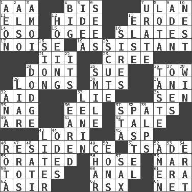 ACROSS 1. American Automobile Association (abbr.) 4. Again 7. ____ Bator 11. Shade tree 12. Flintstone garb 13. Wear away 14. Bear (Spanish) 15. Double curve, resembling the letter S 16. Chalkboards 17. Annoying sound 19. Aide 21. One more than two 23. Algonquian 24. Do not 25. Institute legal proceedings 26. Pull behind 29. Yearns 30. Mountains (abbr.) 31. Cuckoo 32. Assist 33. Whopper 34. Elected rep. 35. Tired old horse 36. Snakelike fish 37. Arguments over trivial matters 40. "We ___ not amused" (Victoria) 41. One (Scot) 42. Story 43. Australian parrot (variant) 45. Viper 46. Home 51. Sadhe (variant) 55. Declaimed 56. Flexible conduit 58. Make imperfect 59. Lugs 60. Of or related to the anus 61. Epoch 62. SW Saudi Arabia district 63. Acura sports coupe 64. Fish or hair follower DOWN 1. Age 2. In addition 3. Mine, in Marseilles 4. Of large size 5. The content of cognition 6. Observes 7. A salt of uric acid 8. Globular water bottle used in Asia 9. Arabian gulf 10. Egg locale 12. Weeding 13. Otherwise 16. Titles for men of rank and authority 18. The Jewish people; Israel 20. Turtle shell scale 22. It is 24. Evade 25. Grin 26. Clothes sense 27. Singles 28. Acquire through effort 29. One who doesn't tell the truth 32. Santa ___, CA 33. Soviet premier 1918-24 36. Having ears or earlike features 37. R.R. building 38. Soft color 39. High mountains 43. 61 cubic inches 44. Lyric poems 46. Roll call or roster of names 47. Greek god of love 48. Suttee (variant) 49. Burn to charcoal 50. Immeasurably long periods of time 52. So be it 53. Have the gumption 54. Part of Q.E.F. 57. Saxophone