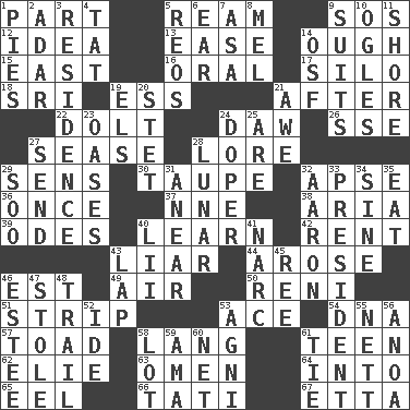 ACROSS 1. Role in a play 5. 480, 500 or 516 sheets of paper 9. Mayday 12. It may be bright or harebrained 13. Comfort 14. Ending for "Through" and "Enough" 15. 90 degrees 16. Spoken 17. Grain storage tower 18. _ Lanka 19. Curvy letter 21. Following 22. Dunce 24. Fool 26. Compass dir. 27. Gospel singer Marvin 28. Old wives' tales, e.g. 29. Elected reps. 30. Grayish beige 32. Domed church section 36. At one time in the past 37. Compass dir. 38. Roberta Peters solo 39. Lyric poems 40. Acquire or gain knowledge or skills 42. Monthly bill 43. One who doesn't tell the truth 44. Came up 46. Eastern Standard Time (abbr.) 49. Atmosphere 50. Painter Guido (1575-1642) 51. Long narrow piece of something 53. Adept person 54. Heredity factor (abbr.) 57. Frog relative 58. Austrian-born American filmmaker Fritz 61. Adolescent 62. Writer Wiesel 63. Presage 64. To the inside or interior of 65. Snakelike fish 66. Jacques of French films 67. Singer James DOWN 1. Sliced desserts 2. The sixth month of the Jewish calendar 3. Home 4. Make lace 5. Vintage cars 6. Ewer handle 7. White ___ sheet 8. Cartoonist voice _ Blanc 9. Sets of matching outer garments 10. Stares at amorously 11. Dinah or Pauly 14. Order of Saint Francis (abbr.) 19. Raised railways 20. Proofreading order 21. Deep reverence 23. Fertile tracts in a desert 24. Drug addict 25. "We ___ not amused" (Victoria) 27. Transmit 28. Type of eclipse 29. "Barney Miller" actor Jack 31. Approach 32. Composer Copland 33. Elected leader of a country 34. Trig term 35. Ingest 40. Cards in a Roman deck? 41. Drug cop 43. Infant locale 45. Portuguese money of account (variant) 46. First name in cosmetics 47. Fur scarf 48. Lag or linger behind 52. Binary compound 53. Hindu god of fire 55. Remaining after all deductions 56. Small Philippine buffalo 58. Car dealer's back yard 59. Wet nurse (var.) 60. Fish or hair follower 61. Neckwear