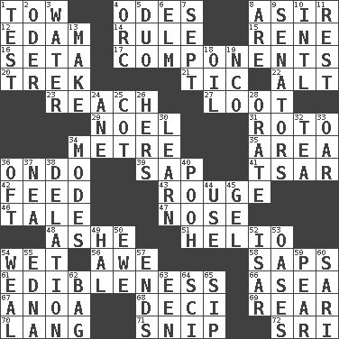 ACROSS 1. Pull behind 4. Lyric poems 8. SW Saudi Arabia district 12. Dutch treat 14. General guideline 15. French philosopher Descartes 16. Stalk of a moss capsule 17. Pieces 20. Long journey 21. Nervous spasm 22. The first octave above the treble staff 23. Arrive at 27. Spoils 29. Christmas carol 31. Printing process, for short 34. Distance measurement (Brit.) 35. Type of rug 36. Southwest Nigerian state 39. Plant excrement 41. Russian ruler of old 42. Nourish 43. Makeup applied to the cheeks 46. Story 47. Sense of smell 48. American tennis player Robert 51. Sun: prefix 54. Soggy 56. Deep reverence 58. Plant excrements 61. The property of being fit to eat 66. At sea 67. Small Philippine buffalo 68. Tenth: prefix 69. Tail end 70. Long (Scottish) 71. Clip 72. Indian title of respect (Mr.) DOWN 1. Trial 2. River in Europe 3. Wetness 4. The grampus (Milton) 5. Superhero pair 6. Shade tree 7. Back-to-school mo. 8. "We ___ not amused" (Victoria) 9. Legislators 10. International (abbr.) 11. Take ten 13. Create 18. Lubricate 19. Non-commissioned officer (abbr.) 24. One (Scot) 25. Small bed 26. Possessive pronoun 28. Speak pompously 30. Acquire or gain knowledge or skills 32. Afternoon social gathering 33. Rowing implement 34. Methods 36. Often (poetically) 37. Teachers' org. 38. Conveyance 40. "Silly old bear" 44. Purpose 45. Set 49. Actor Linden 50. She-sheep 52. Austrian river, tributary to the Danube 53. Fertile tracts in a desert 54. Welt 55. Pulitzer Prize-winning author Ferber 57. Conclusions 59. Lightbulb-shaped fruit 60. Indian skirt 62. Container for groceries 63. Car or cant ending 64. _-fi 65. Small drink